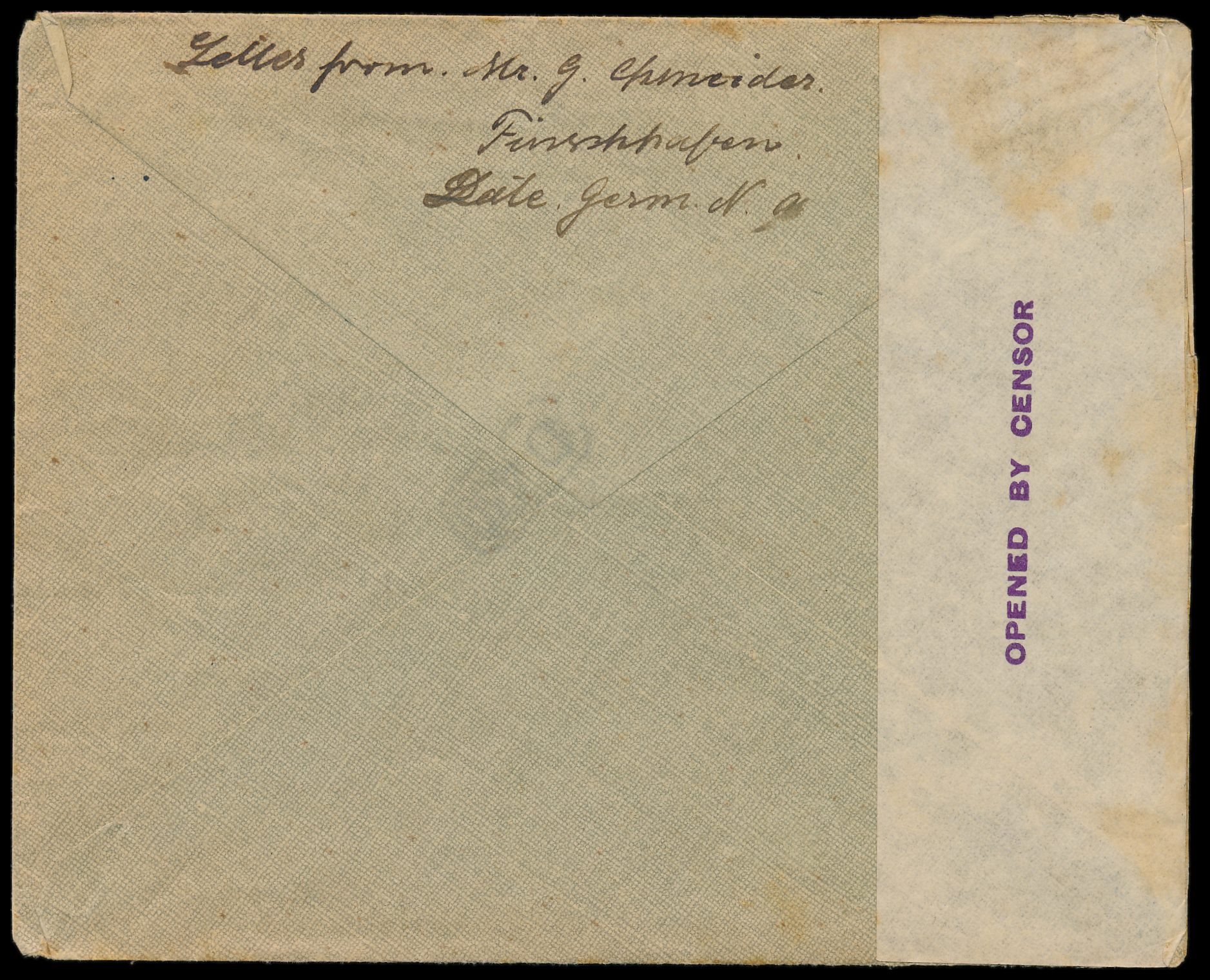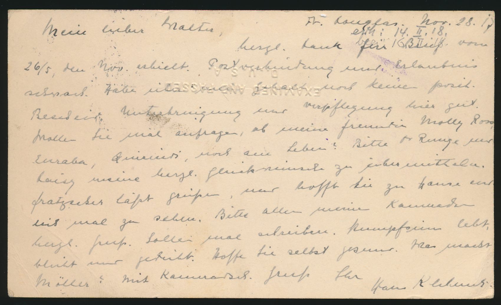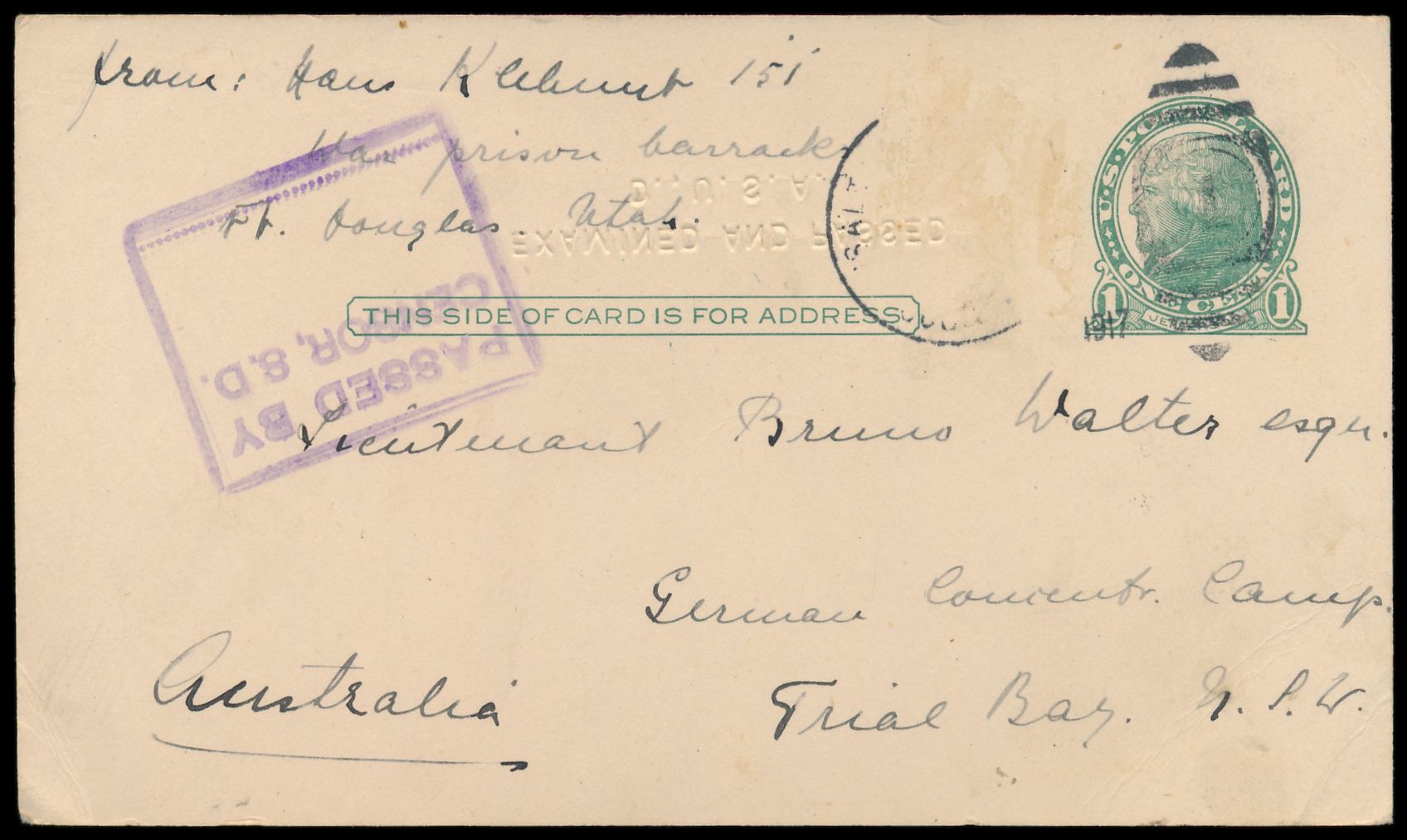 USA-Ganzsache 1 C. mit Stempel Salt Lake City 1917 an Leutnant z. See d. Res. Bruno Walter (nach Kriegsausbruch I. Offizier an Bord des Regierungsdampfers Komet von D.N.G., ab 1.9.1914 S.M.S. Komet) im australischen Kriegsgefangenenlager Trial Bay (N.S.W.), violetter R3 "Passed by / Censor, S.D. / ...", Zusatzfrankatur von der australischen Zensur entfernt, Absender gehört zur Besatzung des ist interniertes Besatzungsmitglied von S. M. Hilfskreuzer Prinz-Eitel-Friedrich, farblos eingeprägter Zensurvermerk "Examined ans Passed / D. U.S.A.", ArGe 700