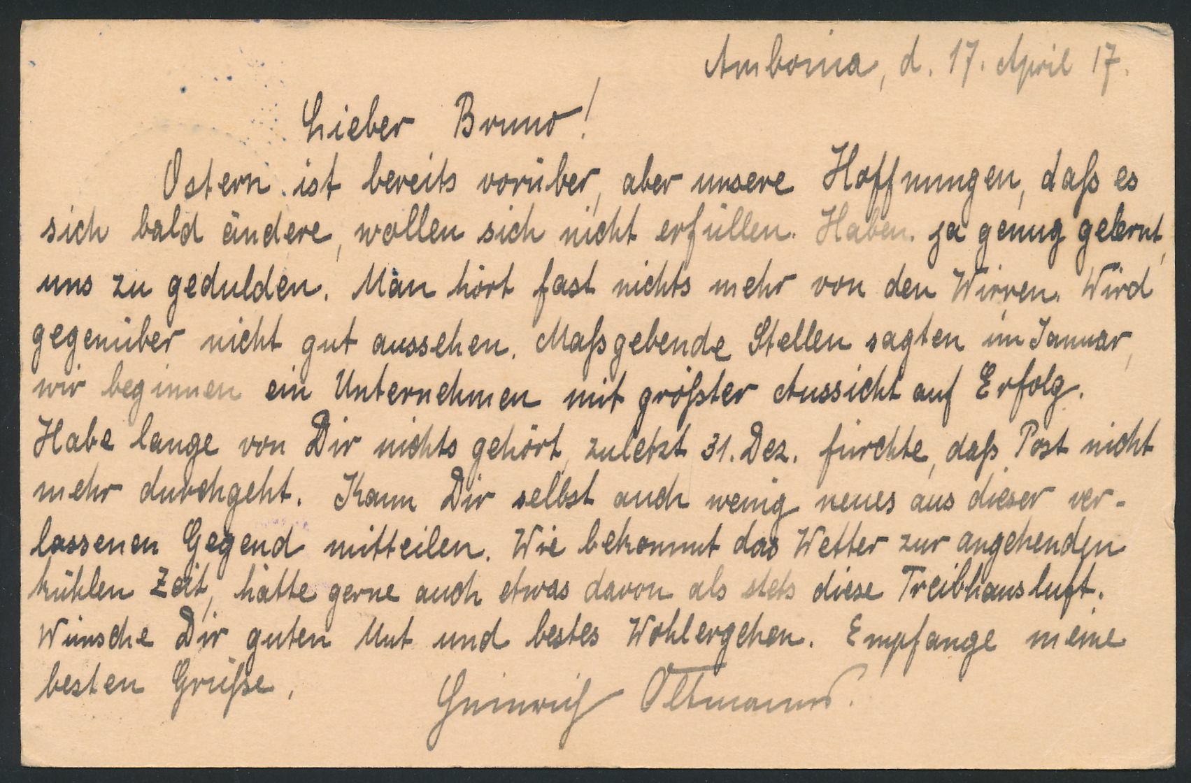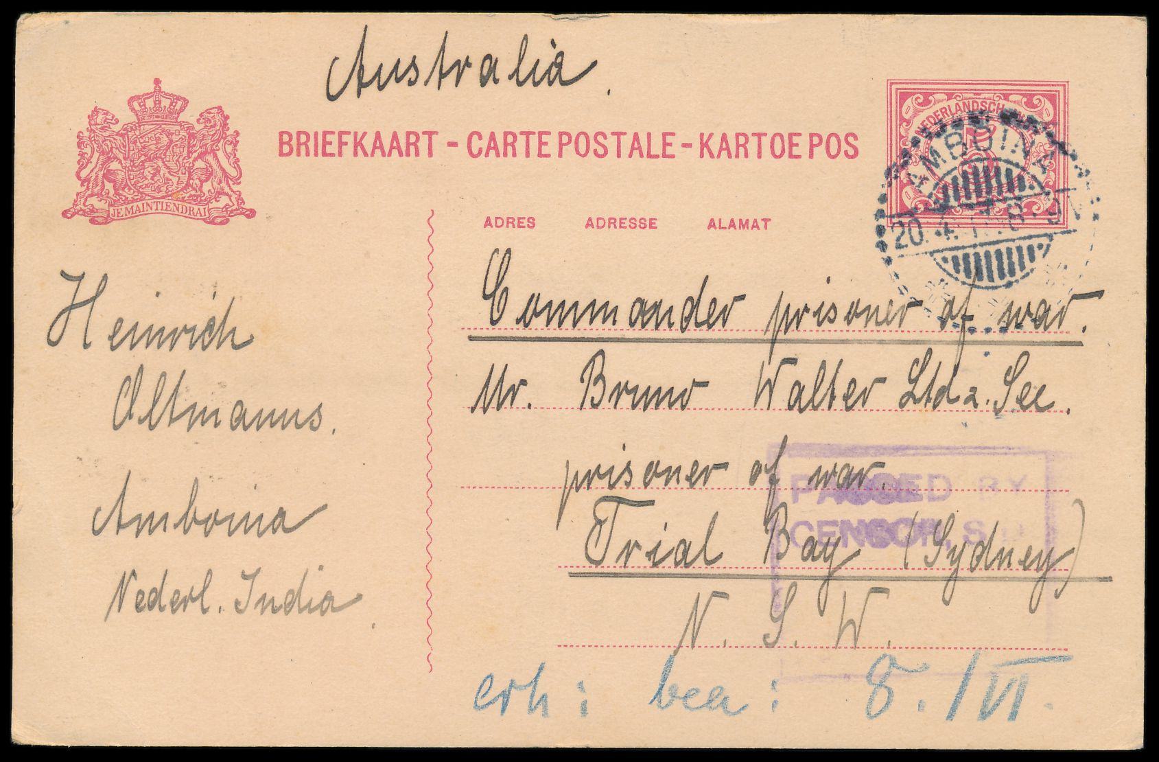 Niederländisch-Indien-Ganzsache mit Stempel Amboina 20.4.17 an Leutnant z. See d. Res. Bruno Walter (nach Kriegsausbruch I. Offizier an Bord des Regierungsdampfers Komet von D.N.G., ab 1.9.1914 S.M.S. Komet) im australischen Kriegsgefangenenlager Trial Bay (N.S.W.), violetter R3 "Passed by / Censor, S.D. / ,,,", Absender ist Heinrich Altmann, Besatzung des Dampfers Manila, der Anfang August Rabaul kommend in Amboina interniert wurde, ArGe 700