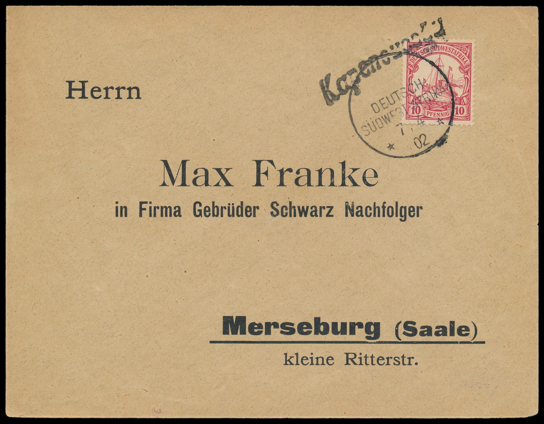 schwarzer L1 Kapenousseu und Wanderstempel 7.4.02 auf Brief mit 10 Pf. nach Merseburg, Bedarf