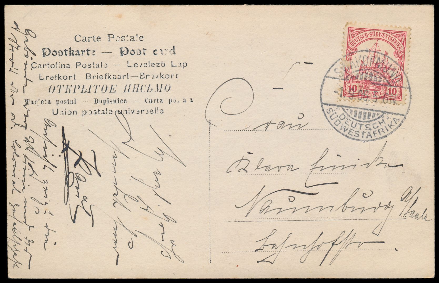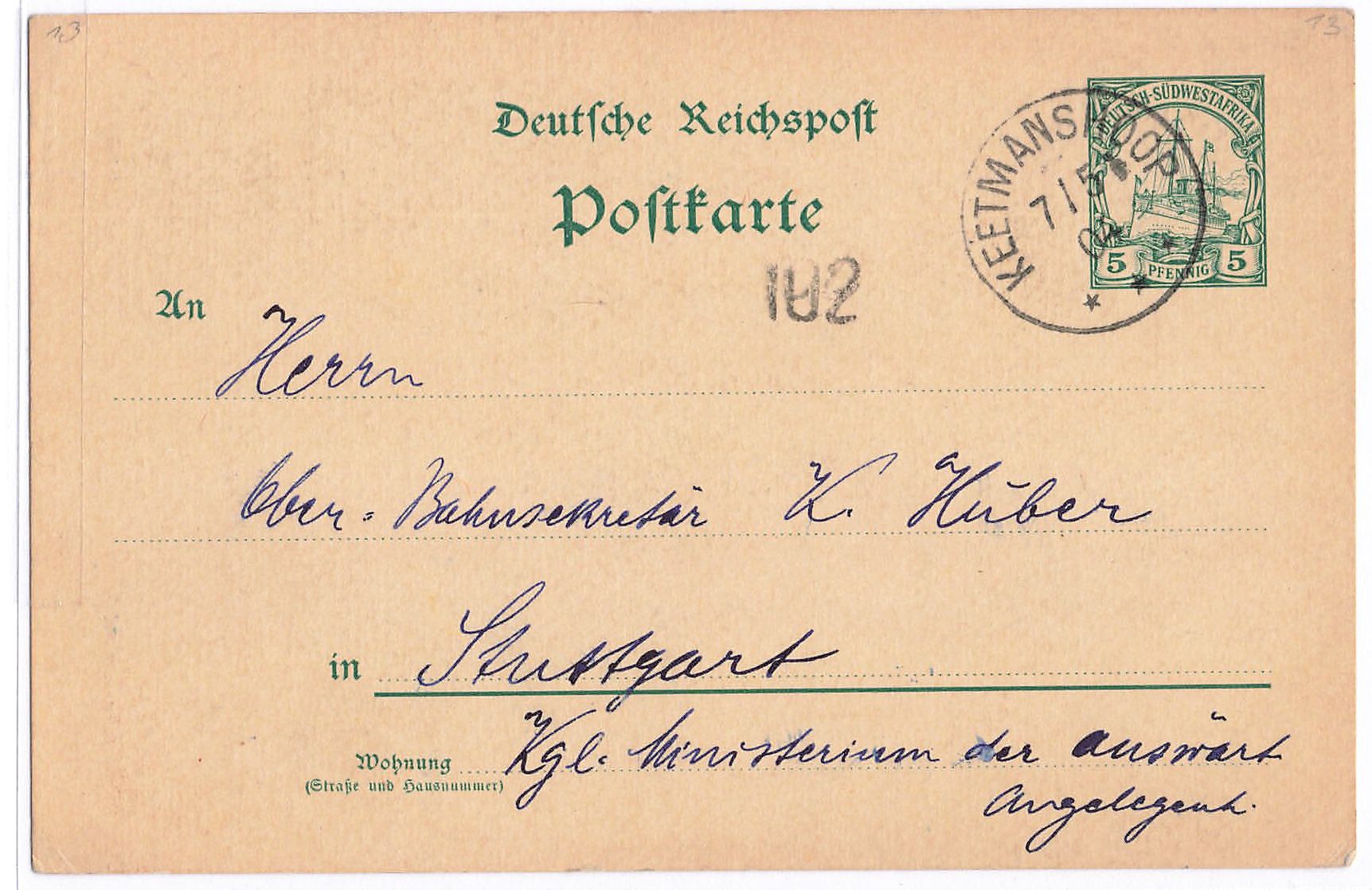 Ganzsache 5 Pf. mit Stempel Keetmanshoop 7.5.04 (mit Dorn hinter Monatszahl) nach Stuttgart, interessanter Text über den Kauf und Versand von Tierfellen und "Bondel-Unruhen", Absenderangabe Weiss, Briefträgerstempel 102 von Stuttgart