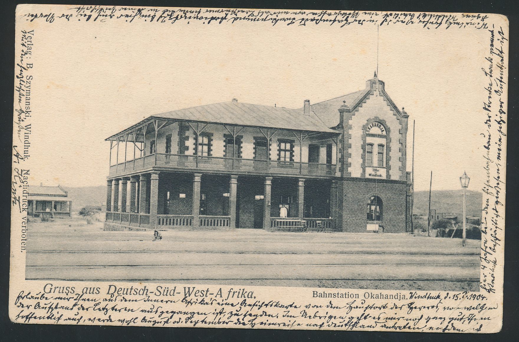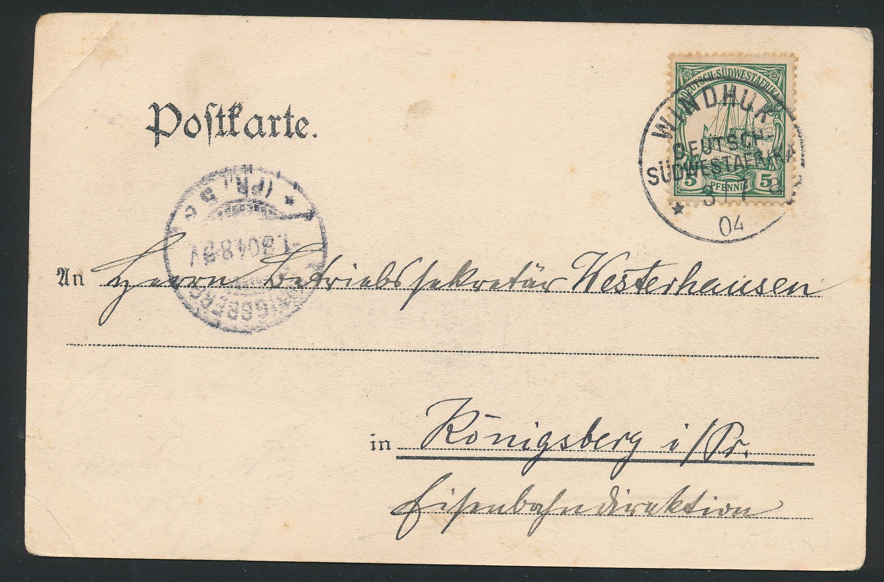 Ansichtskarte Bahnstation Okahandja, Verlag B. Szymanski, Windhuk, Frankatur 5 Pf. (leicht fleckig), Stempel Windhuk 3.7.04, Ankunftstempel Königsberg (Pr.) 5 1.8.04, kleiner Eckbug, Bedarf