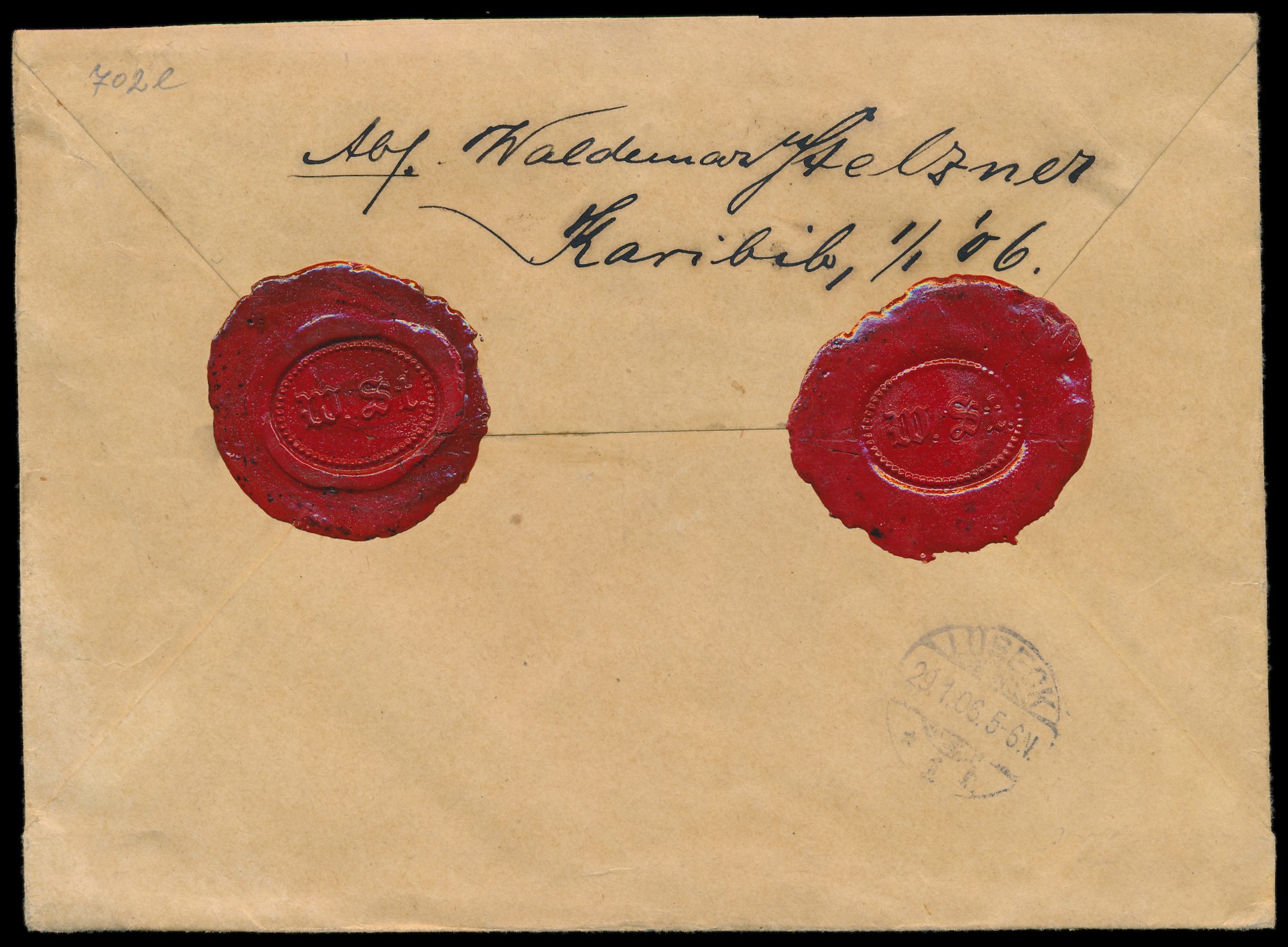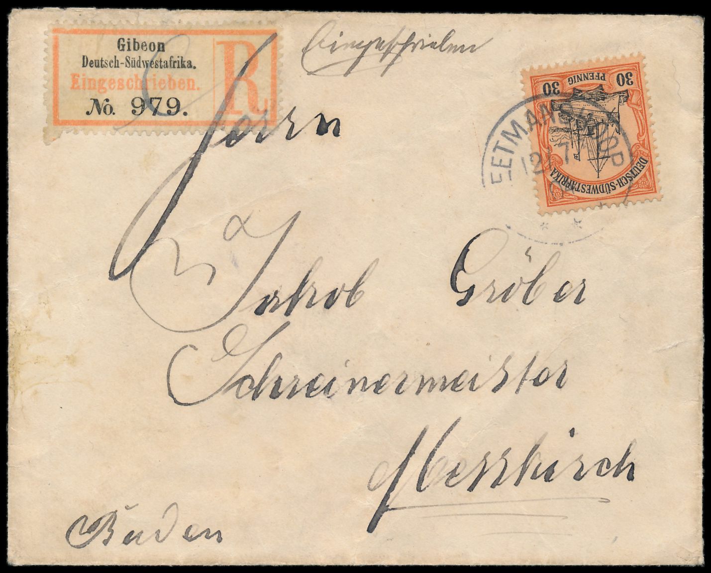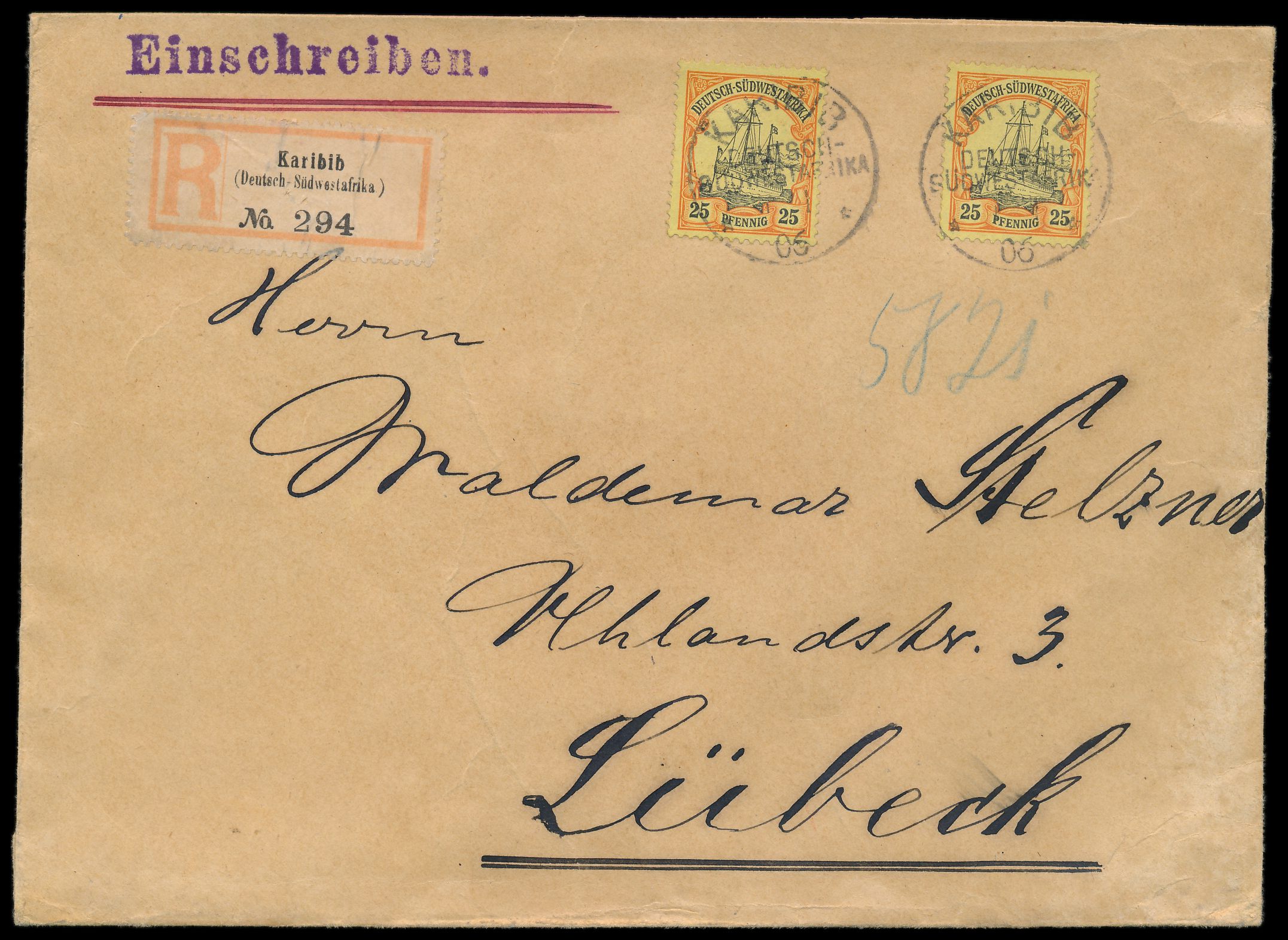 2 x 25 Pf. auf Einschreibbrief mit Stempel Karibib 1.1.06 nach Lübeck, R-Zettel Einfeldt Nr. 4, rückseitig zwei Lacksiegel und handschrifliche Absenderangabe "Waldemar Stelzner, Karibib, 1.1.06", Ankunftstempel 29.1.06, Bedarf