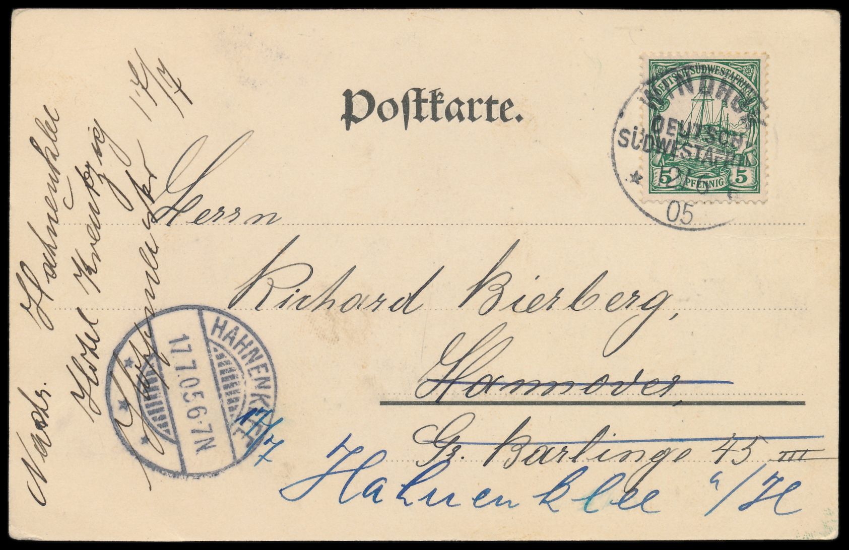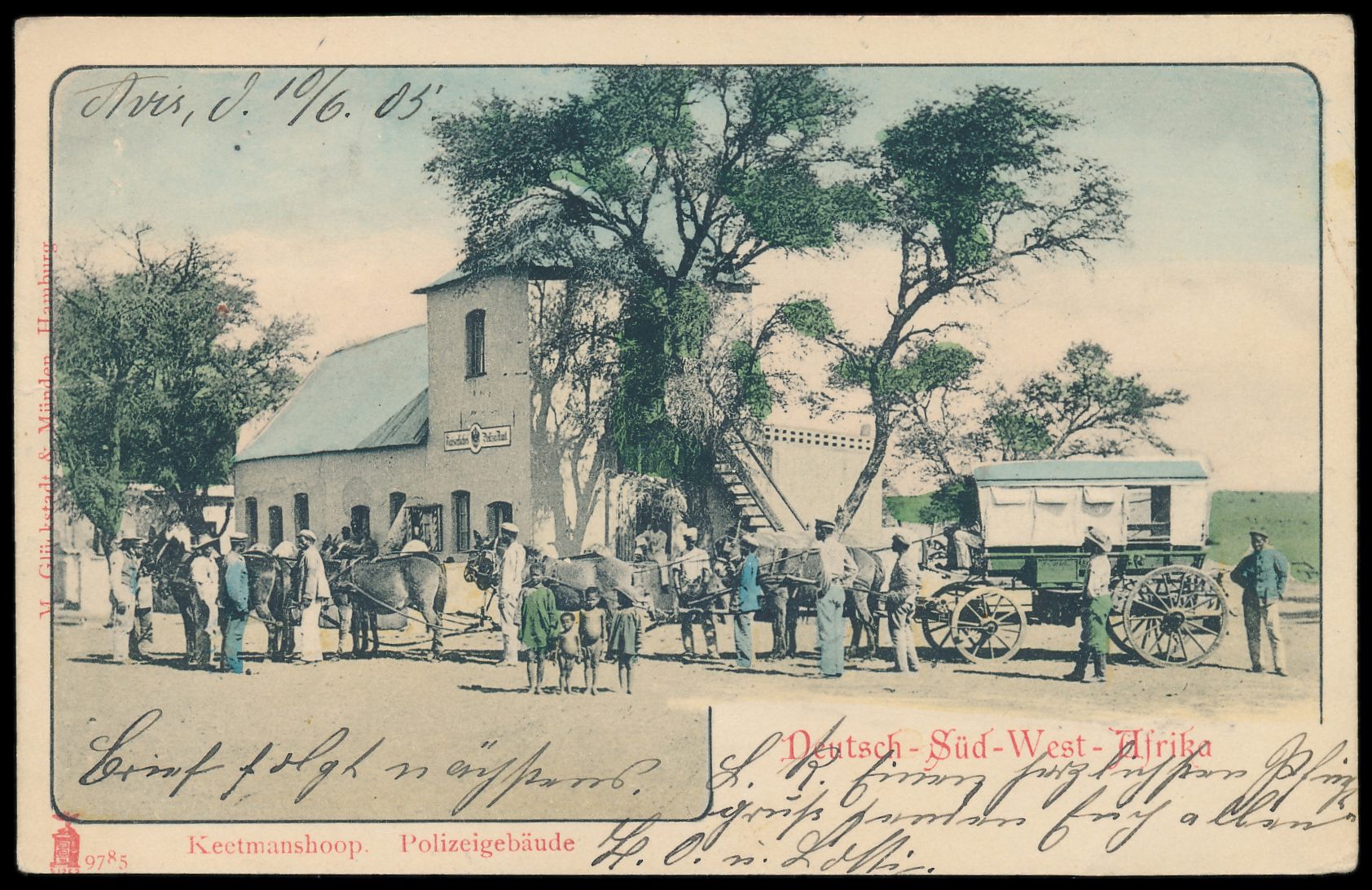 kolorierte Ansichtskarte Keetmanshoop - Polizeigebäude, Verlag M. Glückstadt & Münden, Hamburg, Frankatur 5 Pf., Stempel Windhuk a 12.6.05, geschrieben in Aris am 10.6.1905, nach Hannover, nachgesandt nach Hahnenklee, Ankunftstempel 17.7.05, Bedarf