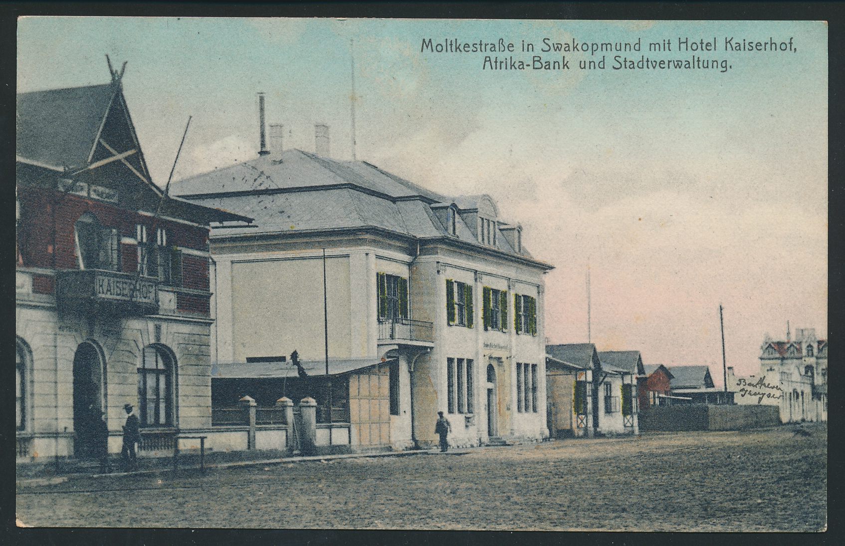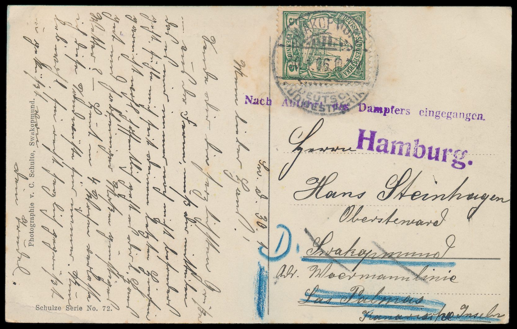 kolorierte Ansichtskarte Moltkestraße in Swakopmund mit Hotel Kaiserhof, Afrika-Bank und Stadtverwaltung, Frankatur 5 Pf., Stempel Swakopmund 30.1.06, Ortskarte, an einen Obersteward der Woermann-Linie, seltener violetter L1 Nach Abfahrt des Dampfers eingegangen und L1 Hamburg für die Nachsendung nach Deutschland, Bedarf