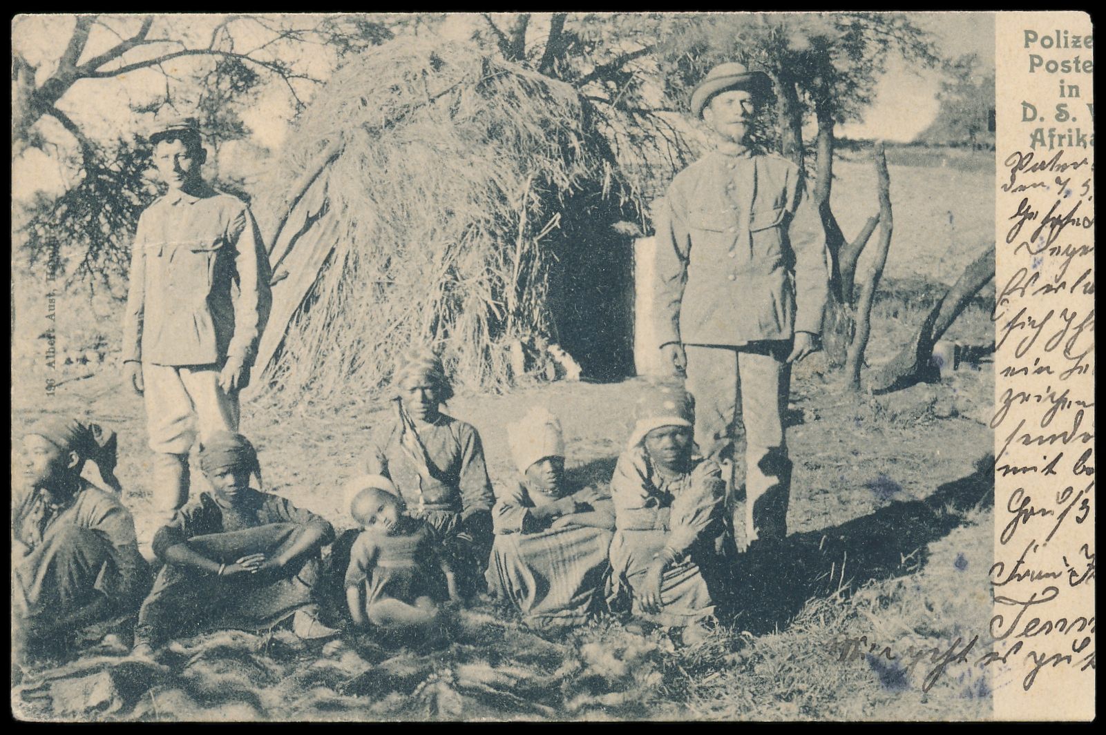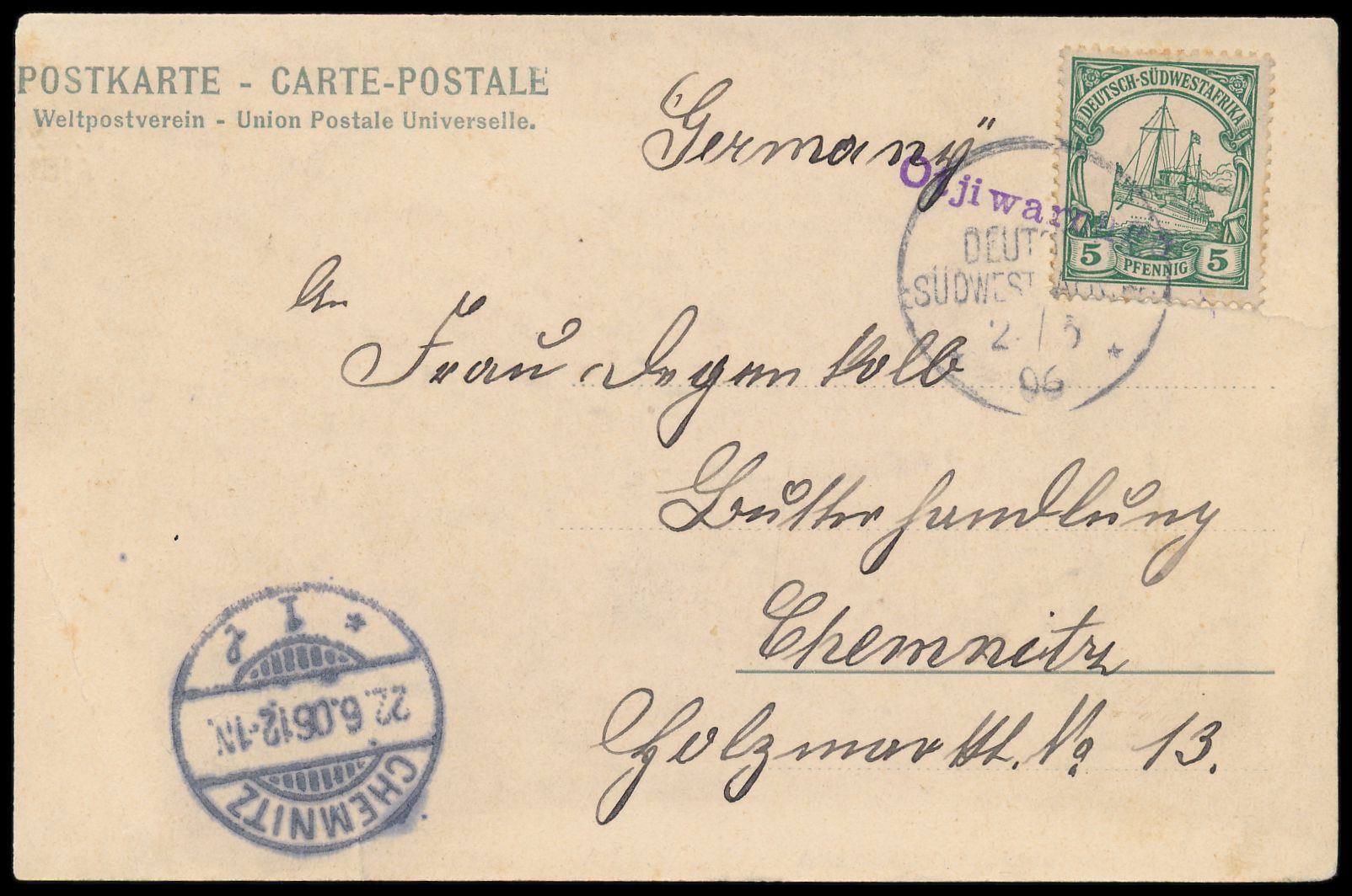 violetter Schreibmaschinenschrift-L1 Otjiwarongo und Wanderstempel 2.6.06 auf Ansichtskarte "Polizei-Posten" nach Chemnitz, Frankatur 5 Pf., Ankunftstempel 22.6.06, Karte ist links ca. 5 mm verkürzt, Bedarf
