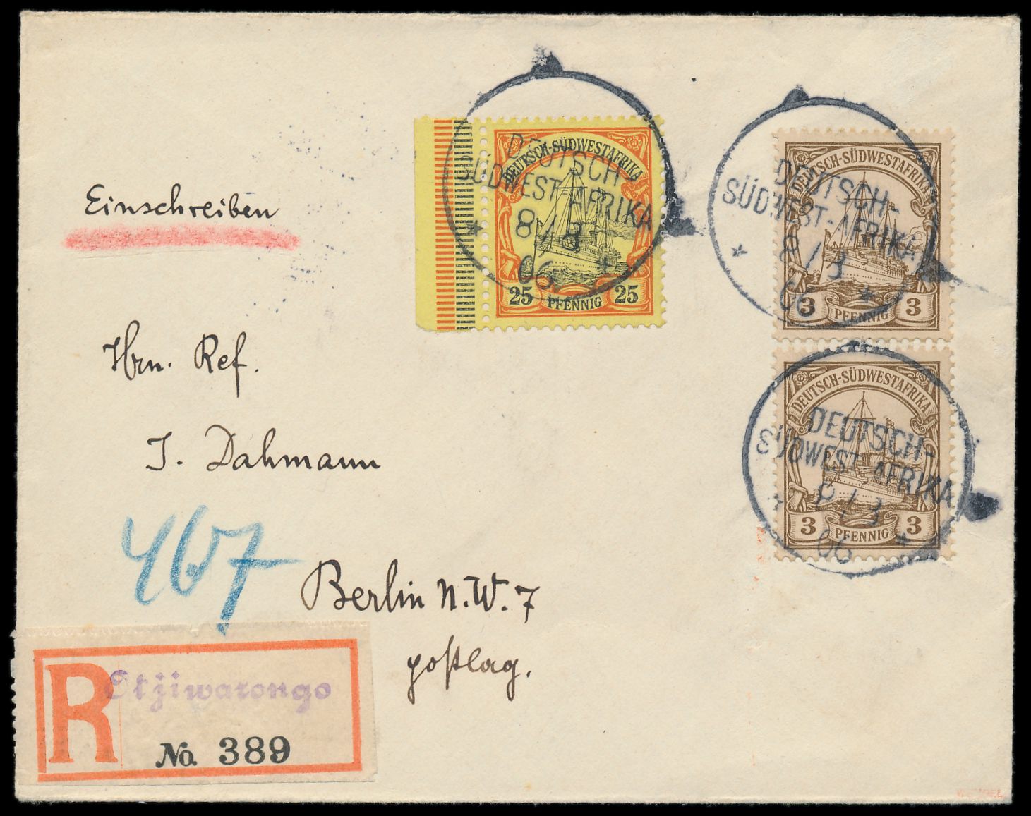 2 x 3 Pf. und 25 Pf. auf Einschreibbrief Otjiwarongo mit Wanderstempel 8.8.06, Blanko-R-Zettel mit violettem Schreibschrift-L1 Otjiwarongo, Einfeldt Nr. 2 II, Ankunftstempel Berlin 10.9.06