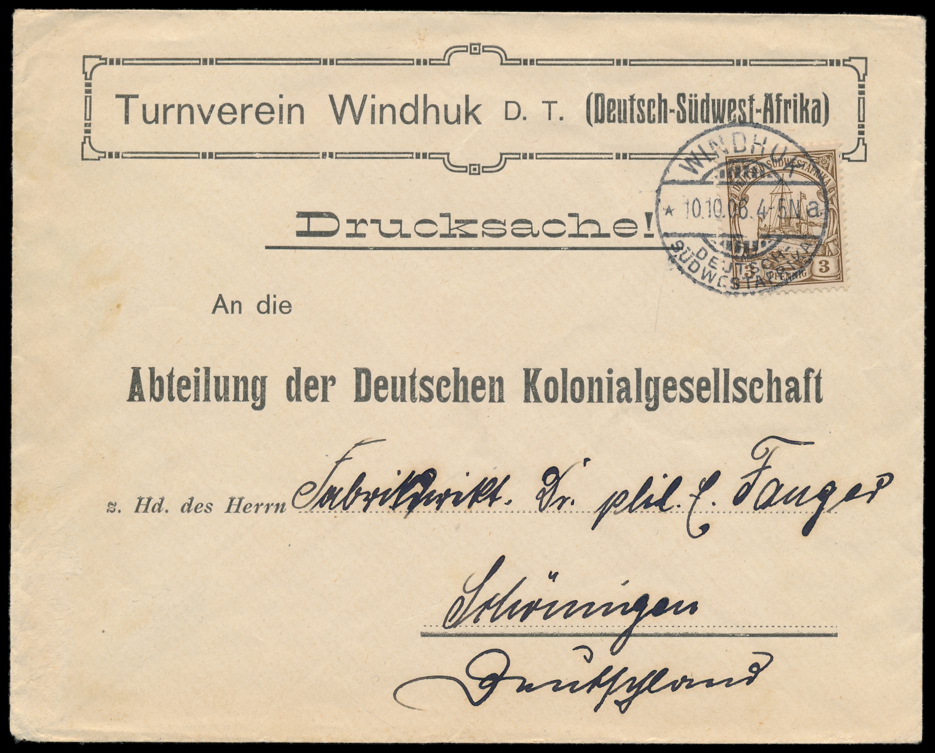 3 Pf. auf Umschlag mit vorderseitigem Absendereindruck Turnverein Windhuk ..., Gitterstempel Windhuk a 10.10.06, Drucksache nach Schöningen, Bedarf