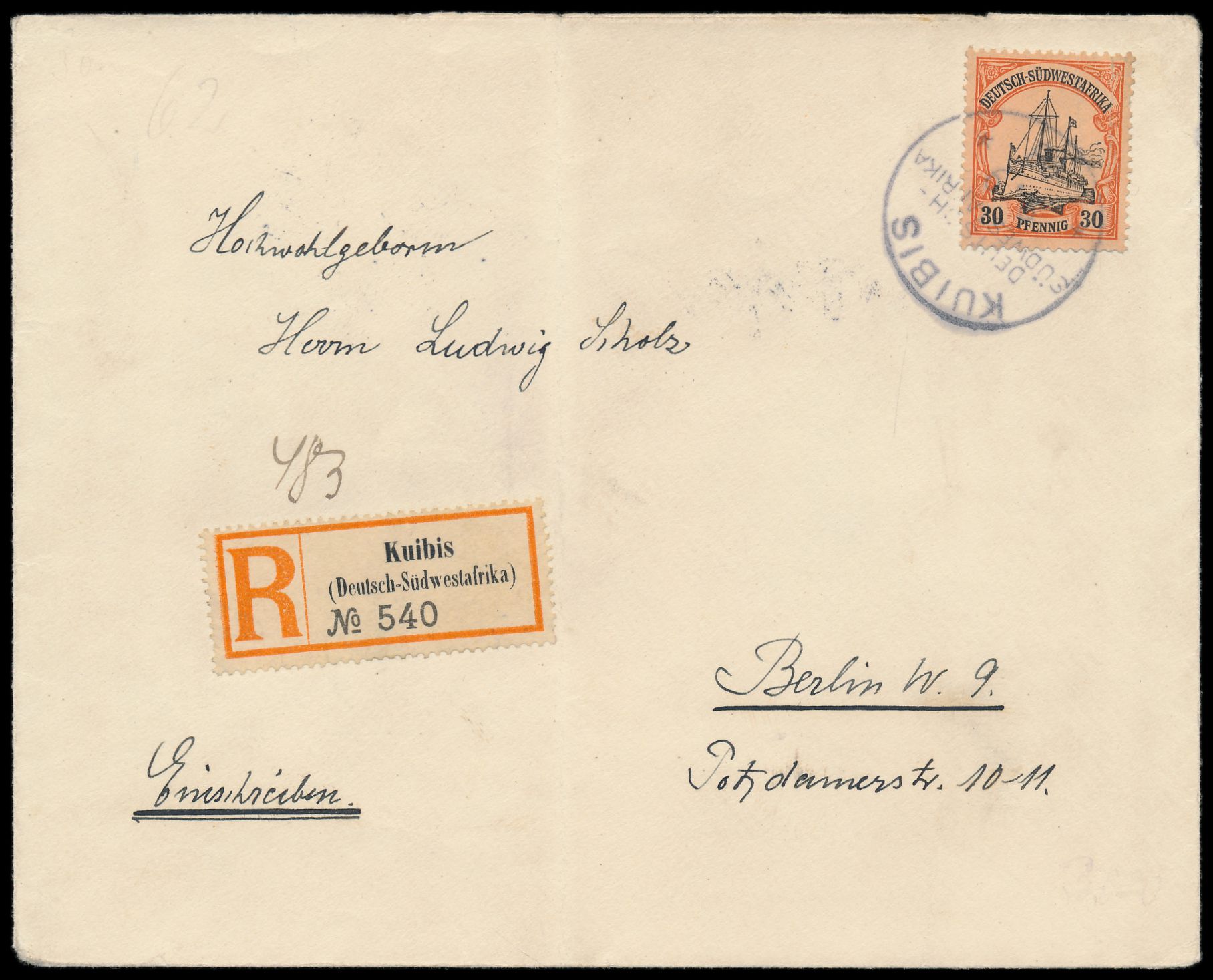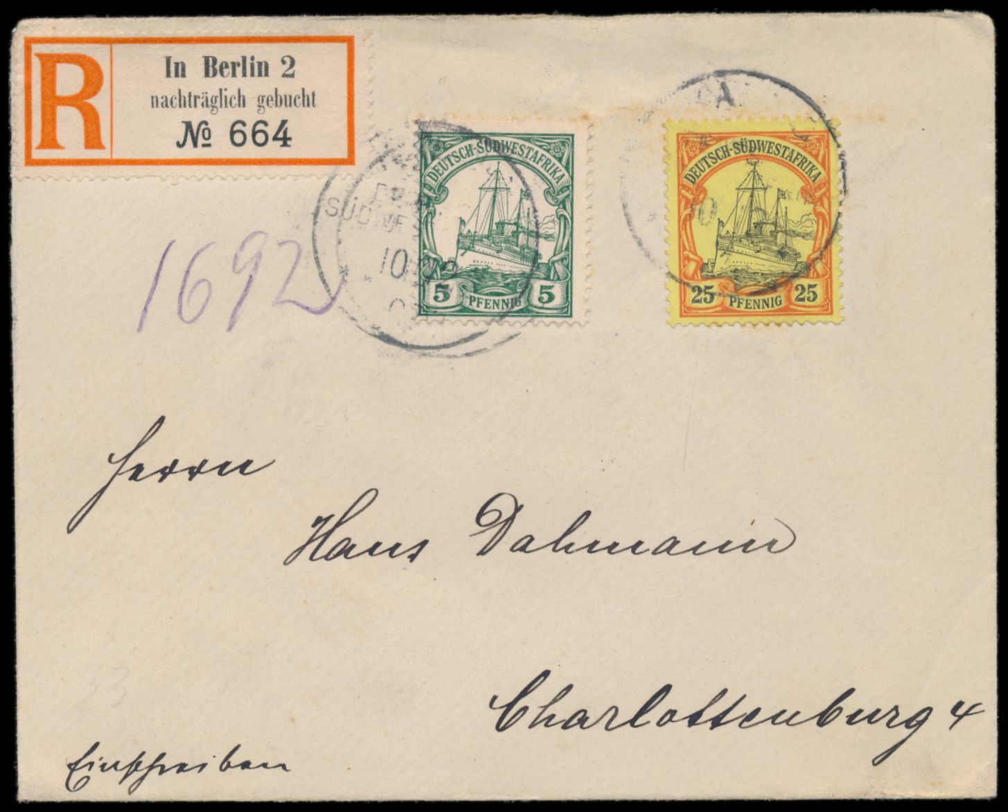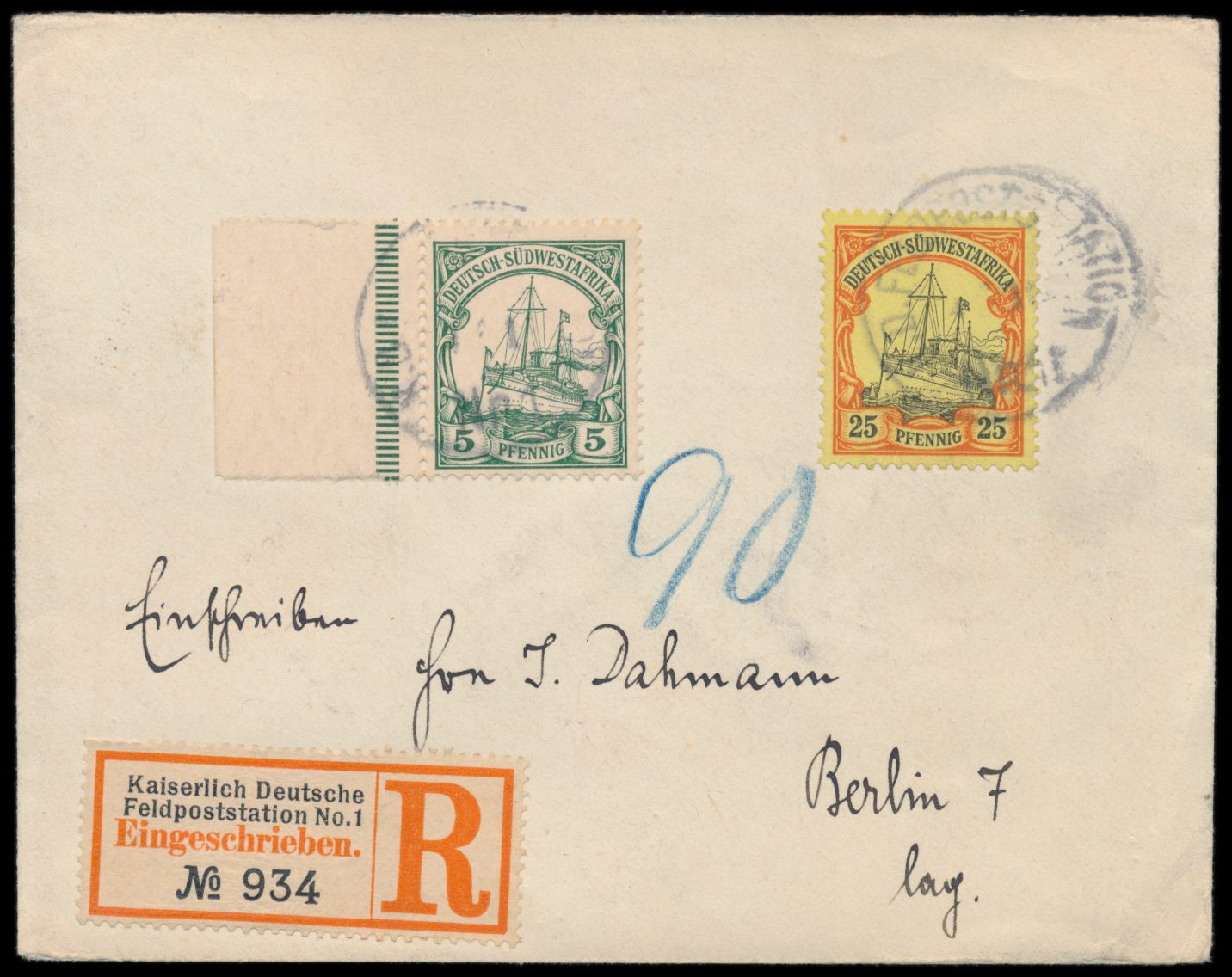 Stempel K. D. Feldpoststation Nr. 1 ?.1.(1907), verwendet bei der Postagentur Otjosondu, zwei etwas unsaubere Abschläge auf Einschreibbrief an Dahmann in Berlin, Frankatur 5 Pf. und 25 Pf., Feldpost-R-Zettel, Ankunftstempel 2.2.07