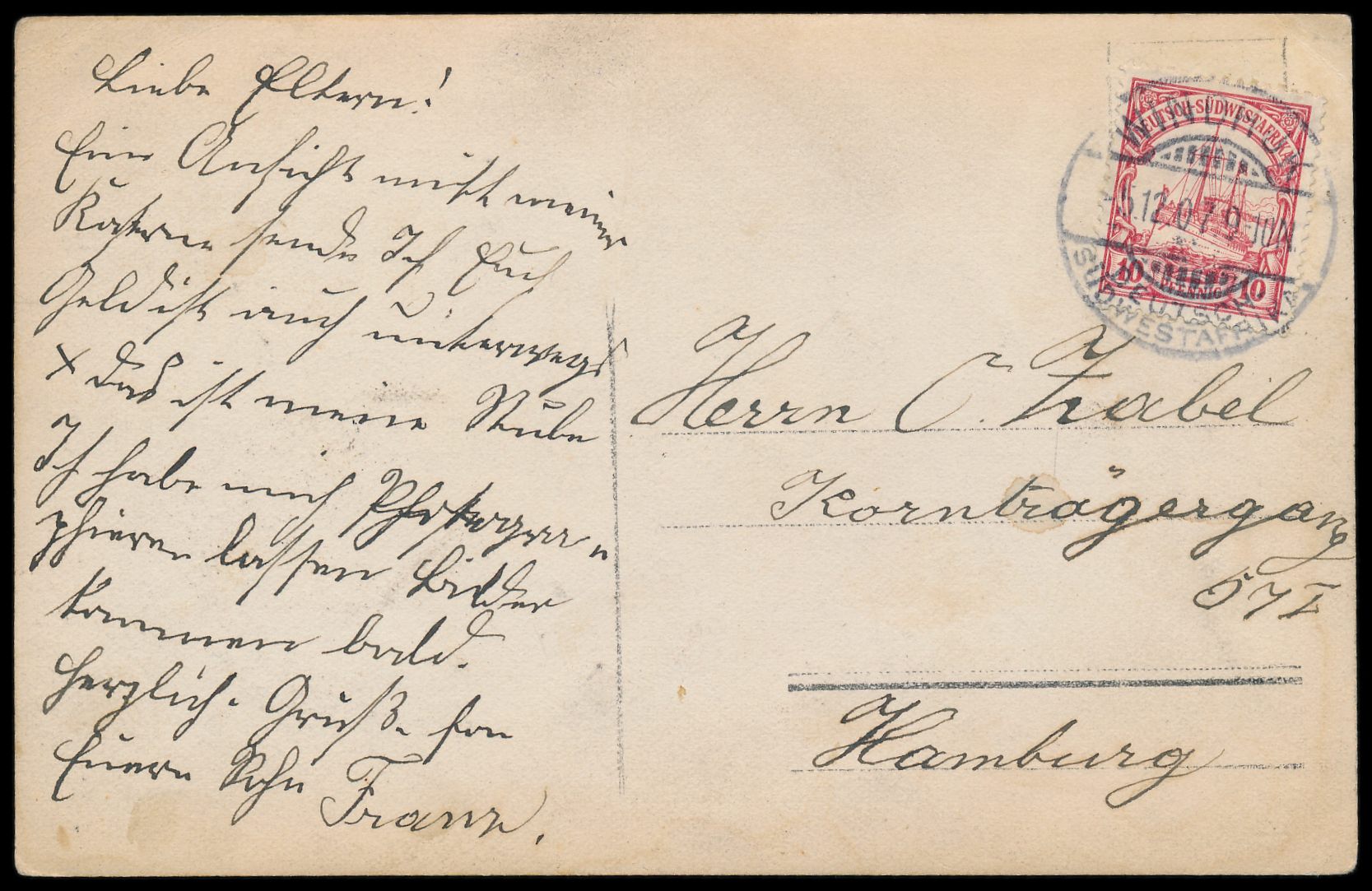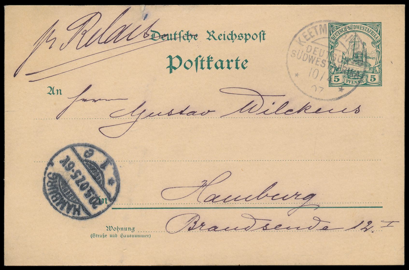 Stempel Keetmanshoop 10.4.07 auf Ganzsache 5 Pf. nach Hamburg, handschriftlicher Vermerk "pr. Relais" des Absenders, Ankunftstempel 20.5.07, Bedarf, Absender Burmester