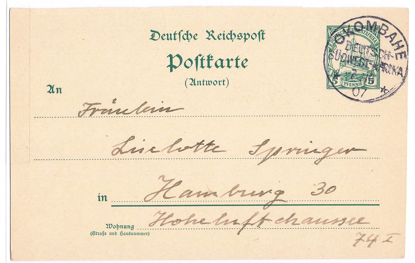 Stempel Okombahe 7.10.07 auf Ganzsachen-Antwortteil 5 Pf. nach Hamburg, Bedarf