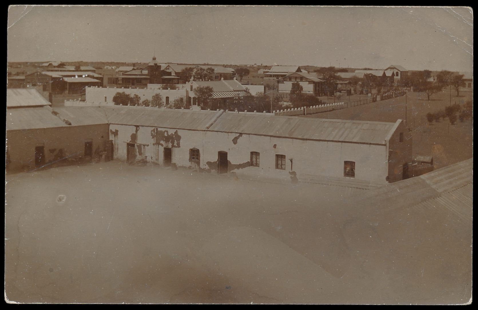 Foto-Ansichtskarte Kaserne in Windhuk (laut Kartentext), Privataufnahme, Frankatur 10 Pf., Stempel Windhuk 5.12.07, nach Hamburg, Bedarf