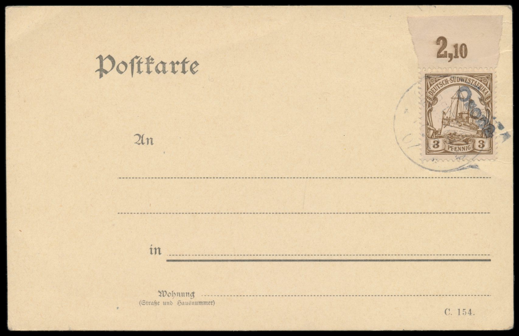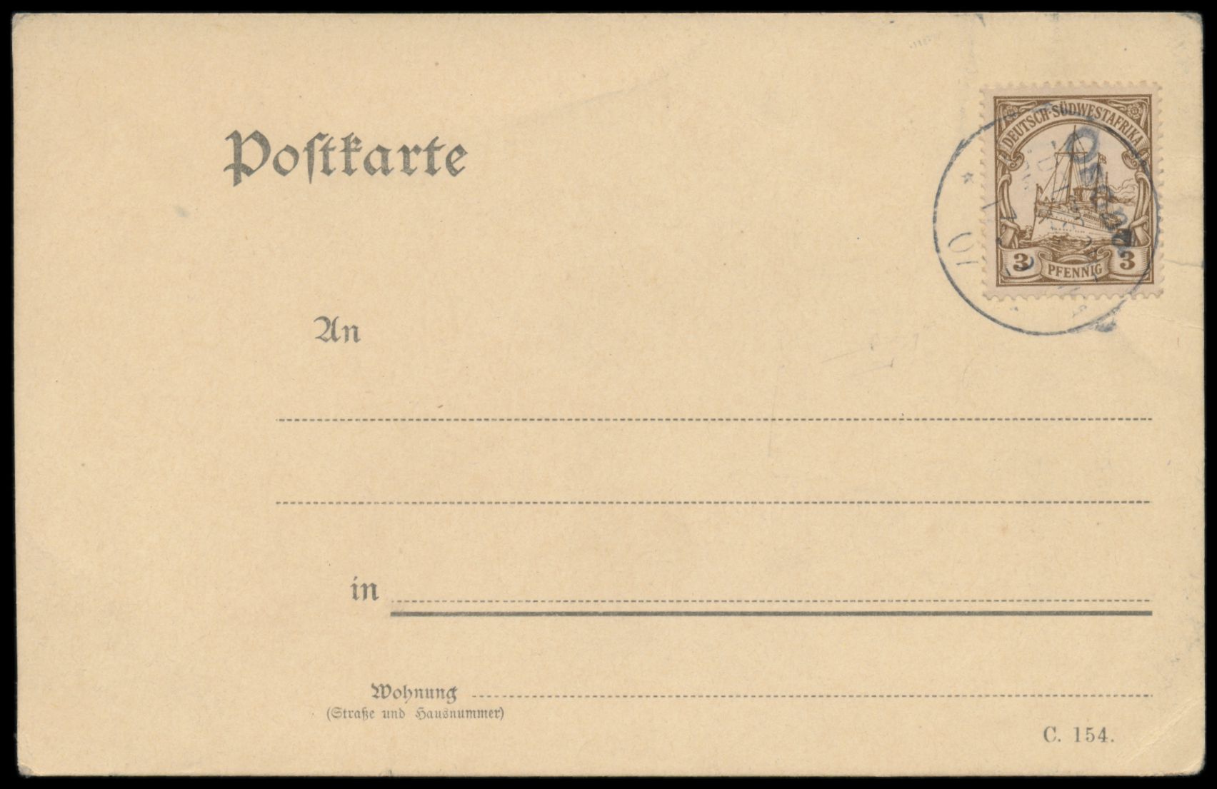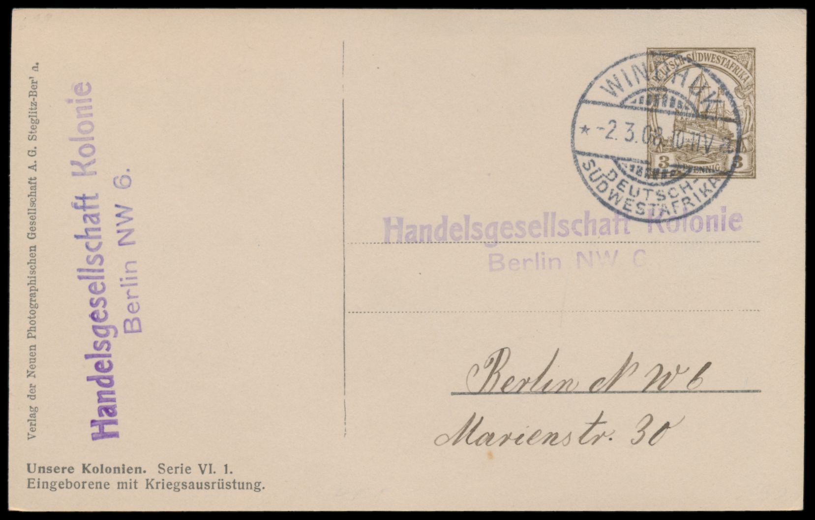Privatganzsache 3 Pf., Bild "Eingeborene in Kriegsausrüstung", Frech PP 4 E 1, Stempel Windhuk a 2.3.08, nach Berlin