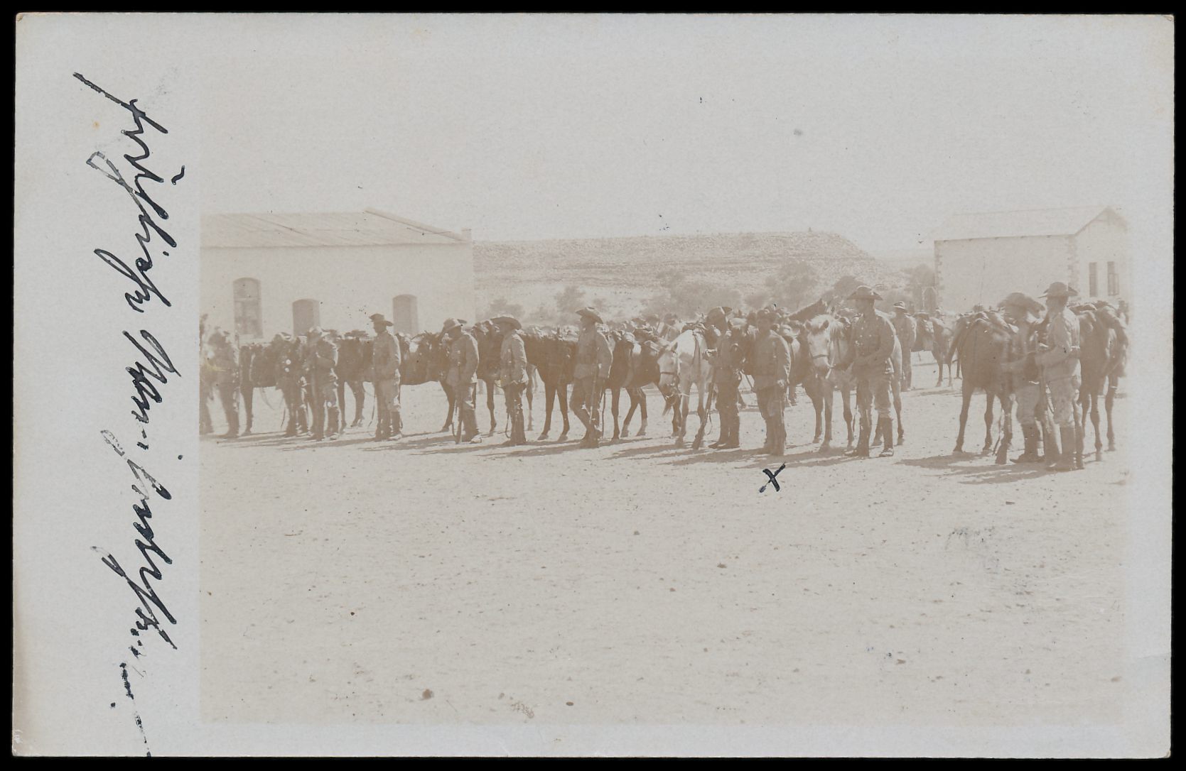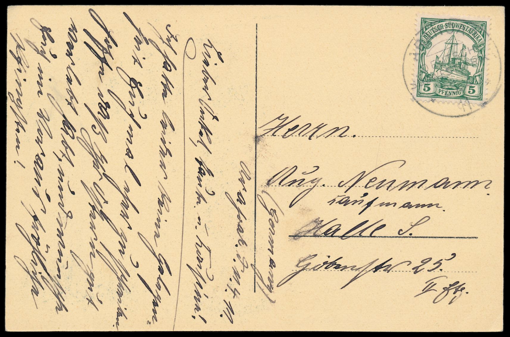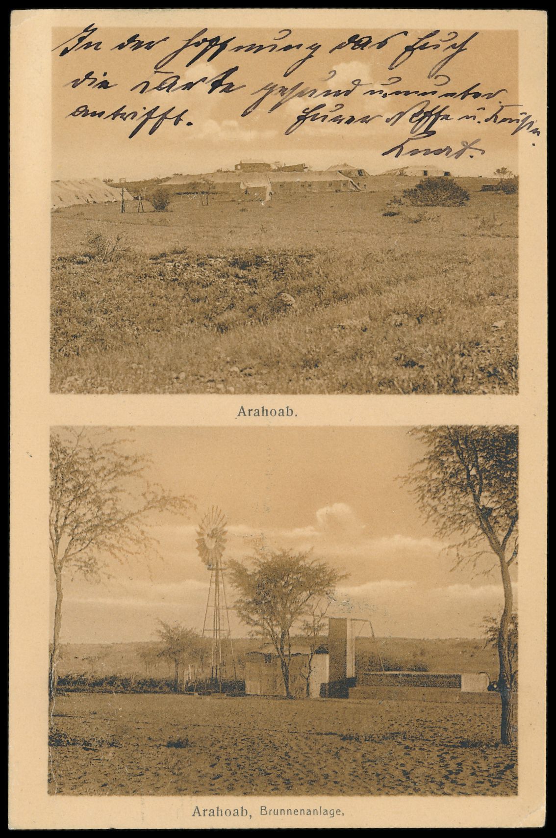 Stempel Arahoab 25.4.11 auf Zweibild-Ansichtskarte Arahoab / Brunnenanlage, Frankatur 5 Pf., nach Halle, Bedarf