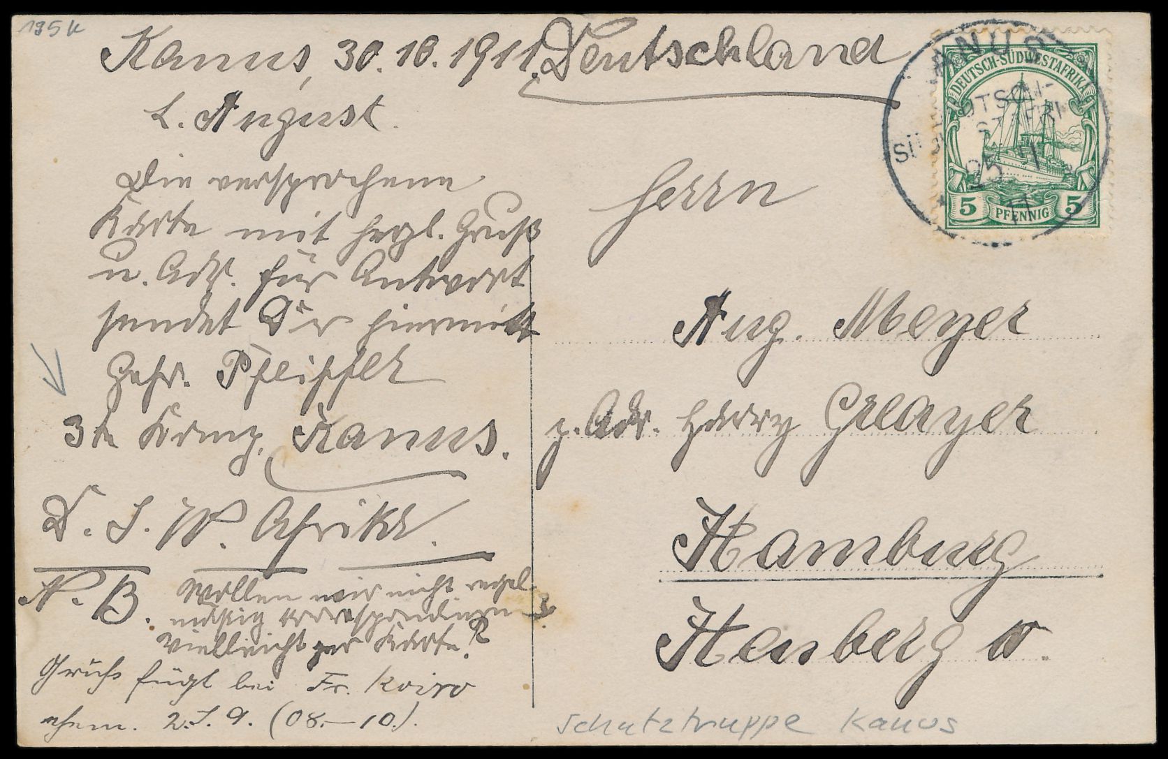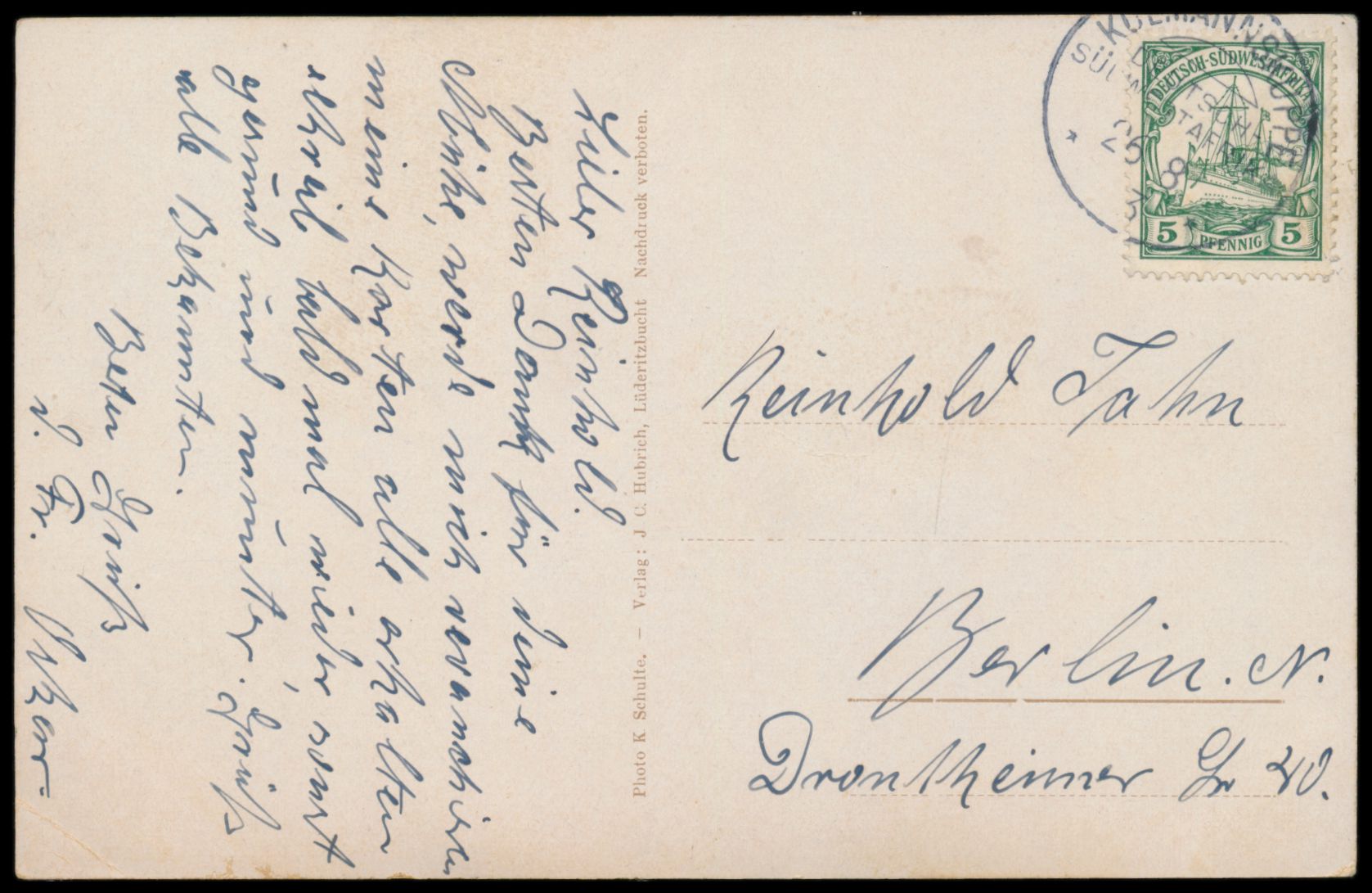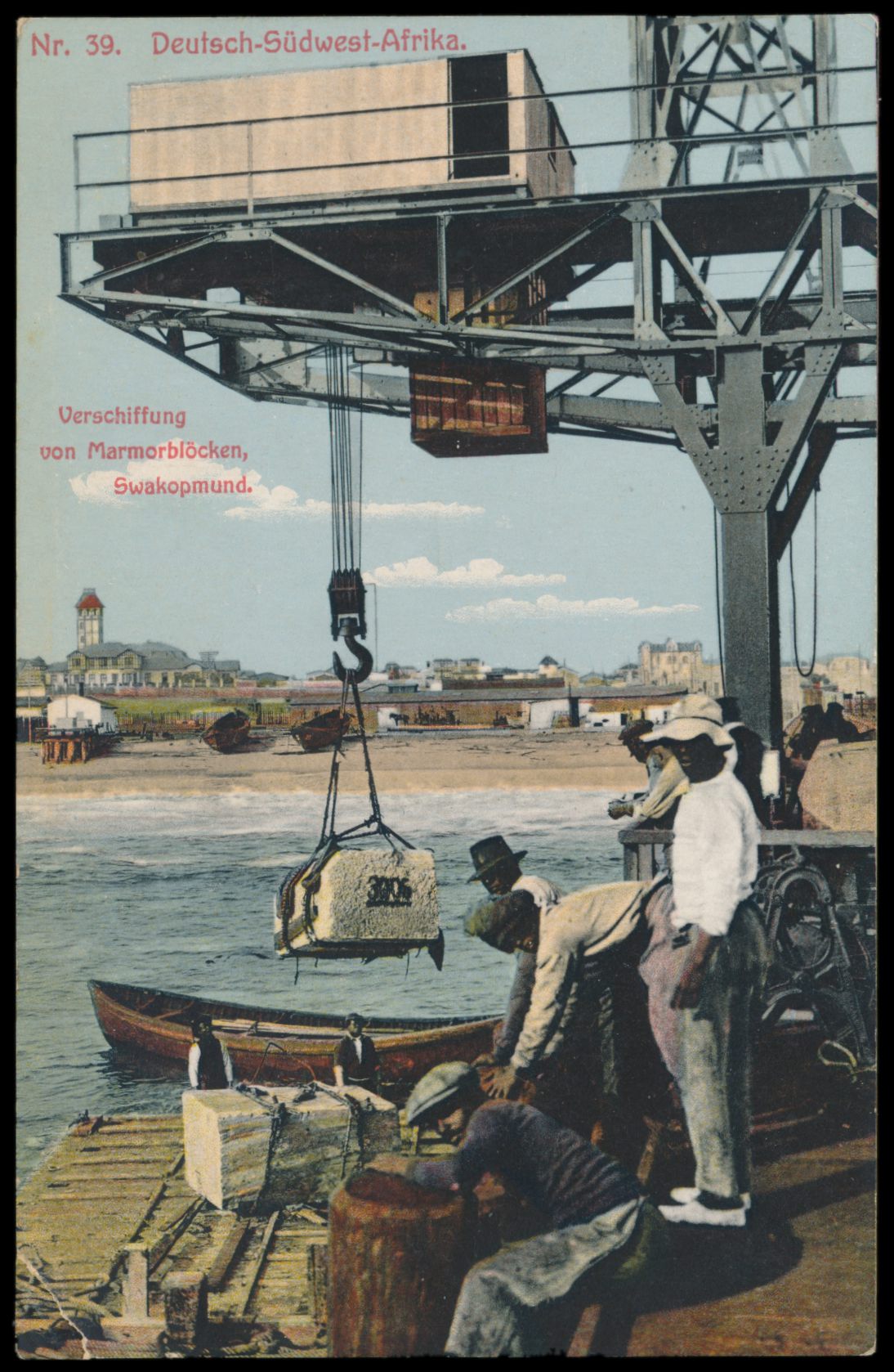 mehrfarbige Ansichtskarte "Verschiffung von Marmorblöcken, Swakopmund" , Verlag J. C. Hubrich, Frankatur 5 Pf., Stempel Kolmannskuppe 26.8.13, nach Berlin, Bedarf