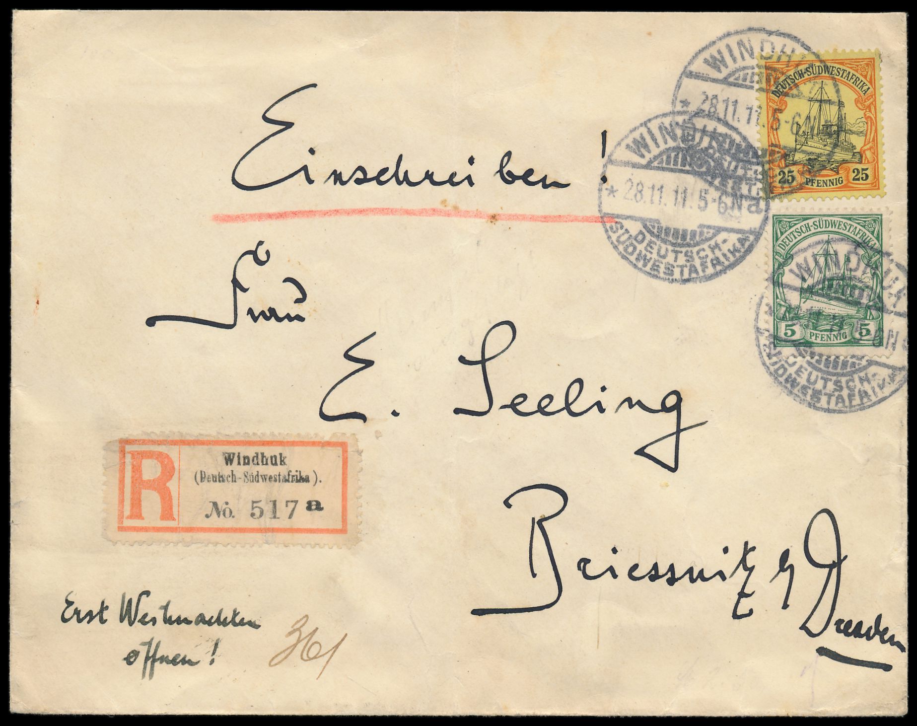 5 Pf. und 25 Pf. auf Einschreibbrief mit Gitterstempel Windhuk a 28.11.11 nach Deutschland, R-Zettel mit Ub a, Einfeldt Nr. 8 a II, Ankunftstempel Dresden 21.12.11, schwacher senkrechter Mittelbug, Bedarf