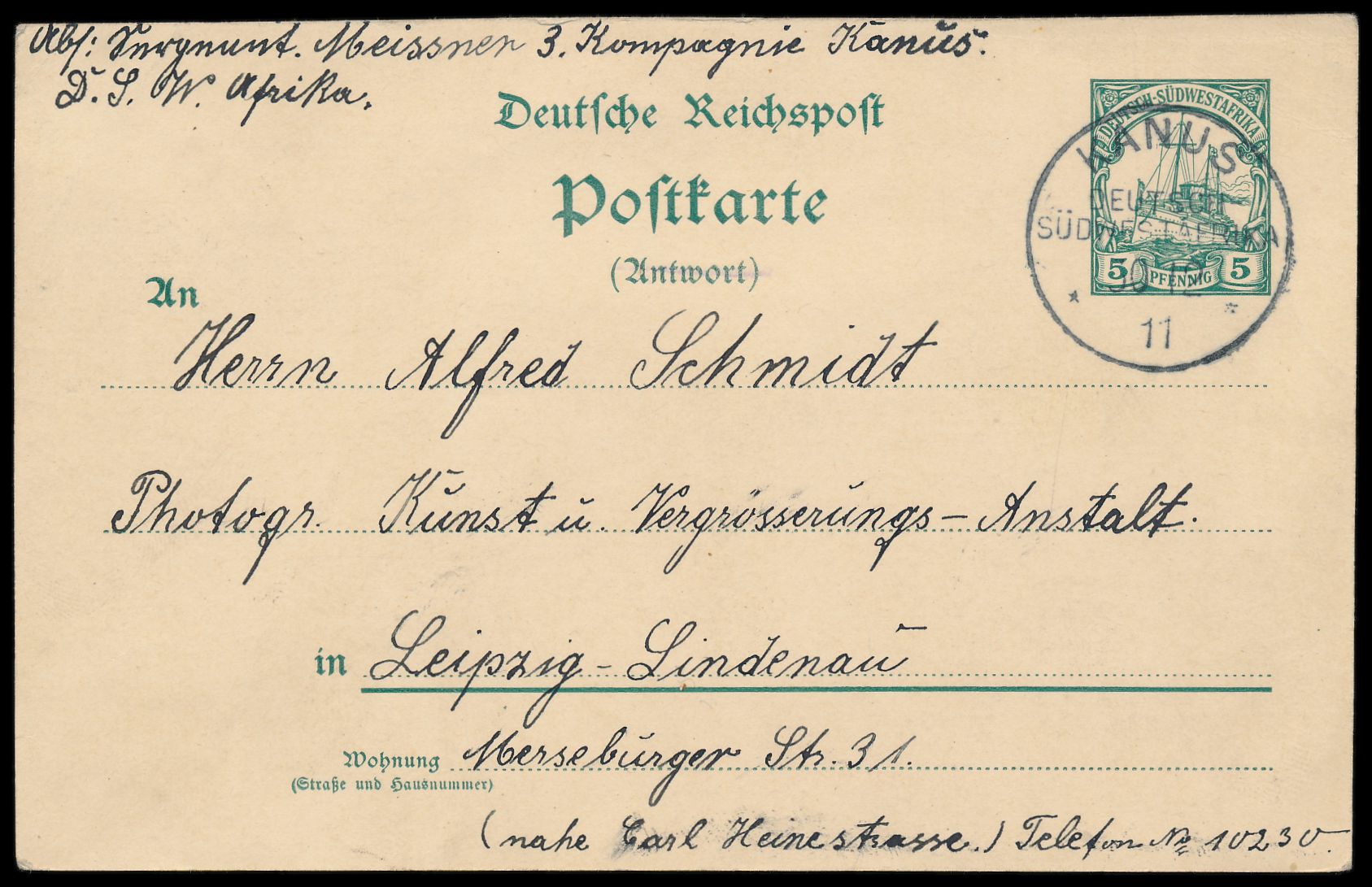 Stempel Kanus 30.12.11 auf Ganzsachen-Antwortteil 5 Pf. nach Leipzig, vorderseitig handschriftlicher Absender "... 3. Kompagnie Kanus ...", langer Bedarfstext