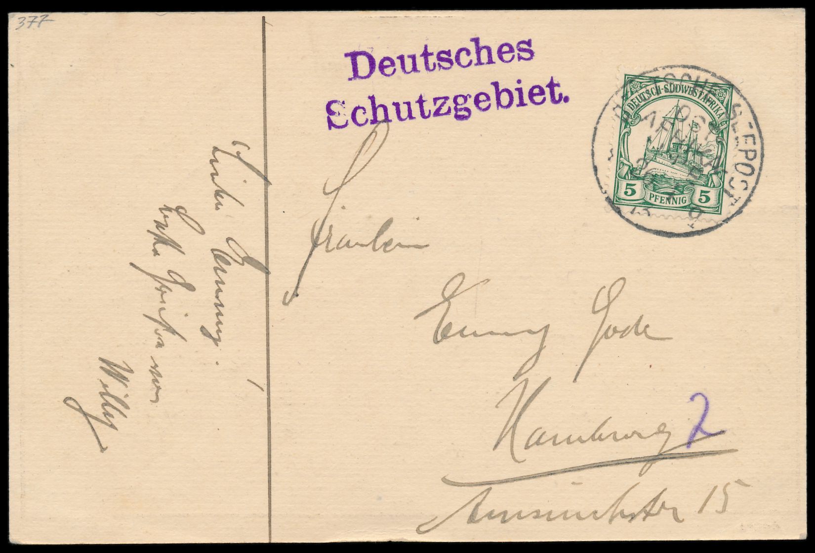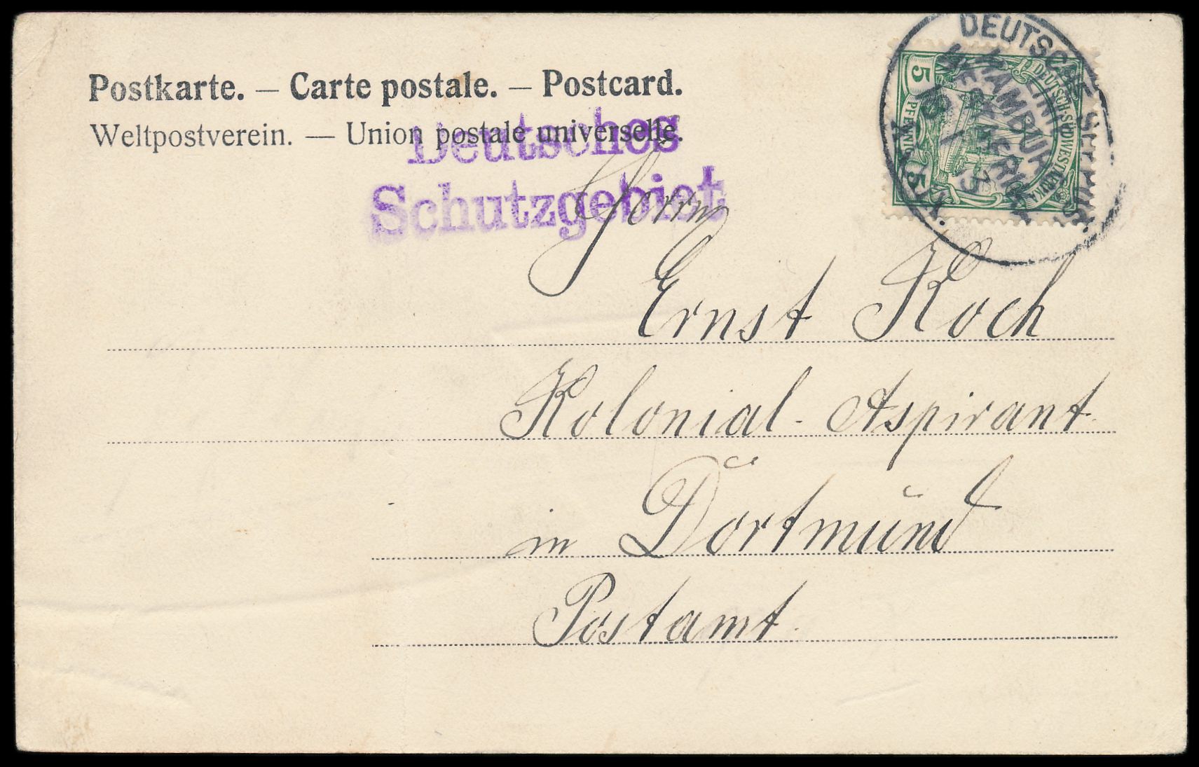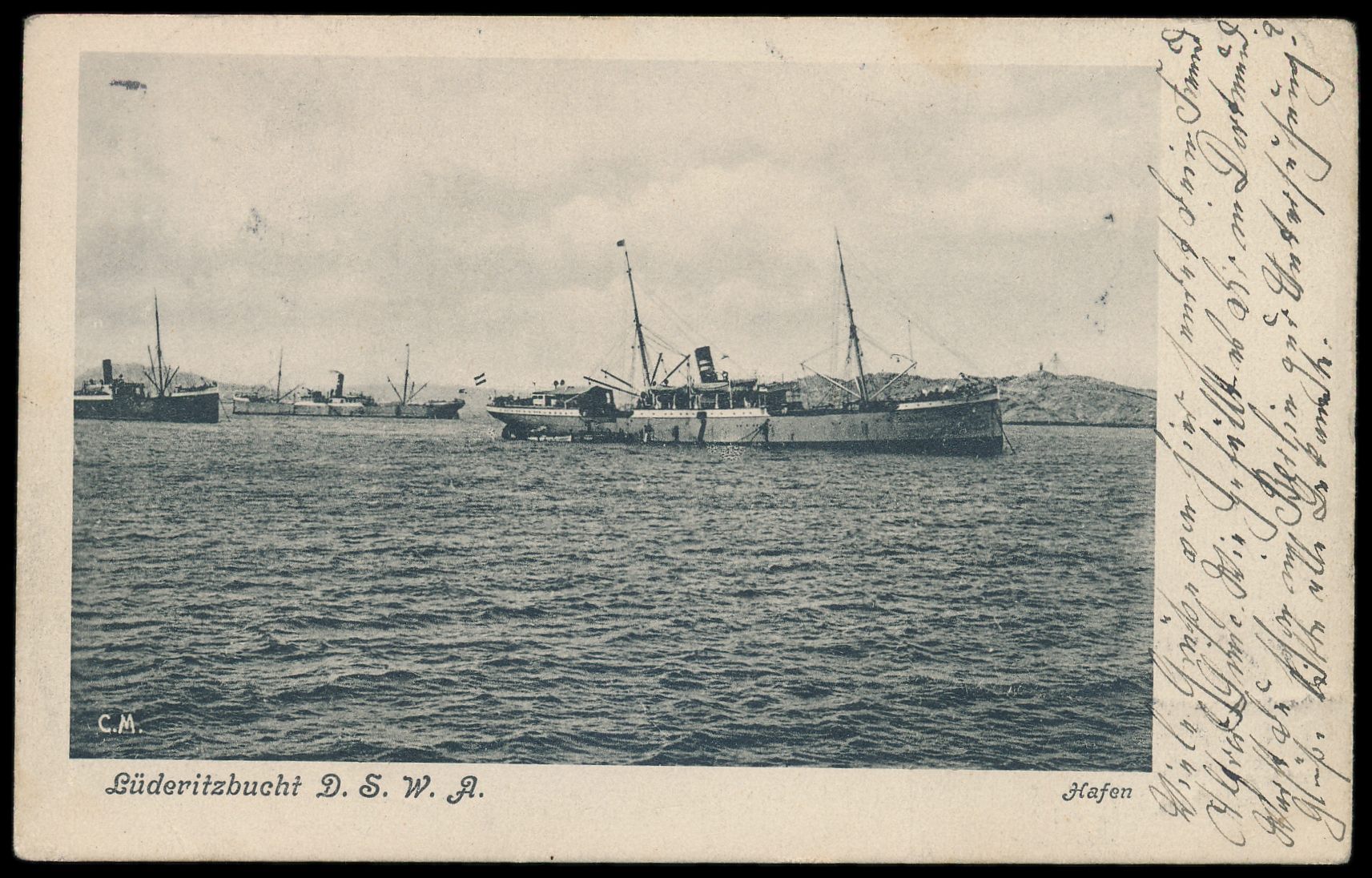 Deutsche Seepost Linie Hamburg - Westafrika XXXIX. 18.1.13, Dampfer Frieda Woermann, eingesetzt auf der Linie Deutsch-Südwestafrika - Capstadt, Frankatur DSWA 5 Pf., violetter L2 Deutsches Schutzgebiet, Ansichtskarte Lüderitzbucht - Hafen, nach Dortmund, Bedarf
