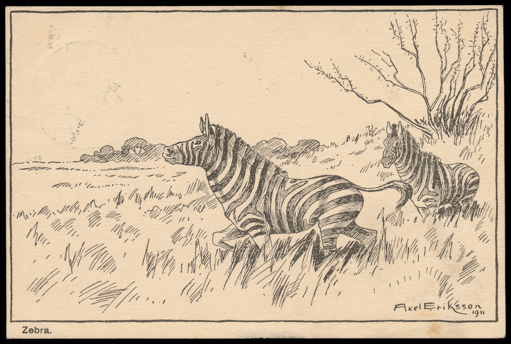 Stempel Deutsche Seepost Ost-Afrika-Linie q 26.4.13, Dampfer Feldmarschall, an diesem Tag in Swakopmund, violetter L2 Deutsches Schutzgebiet., Künstler-Ansichtskarte "Zebra" mit Künstler-Signatur Axel Erilsson, Frankatur DSWA 5 Pf., nach Hamburg