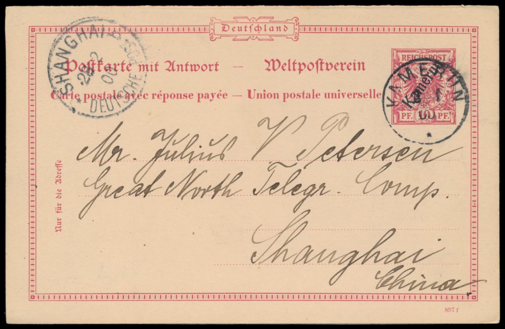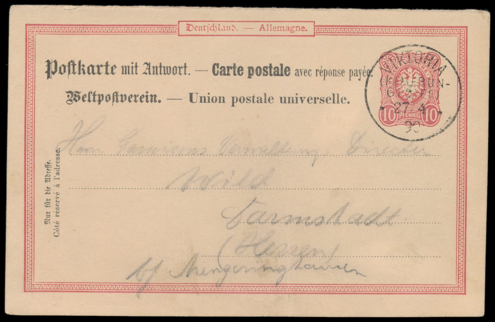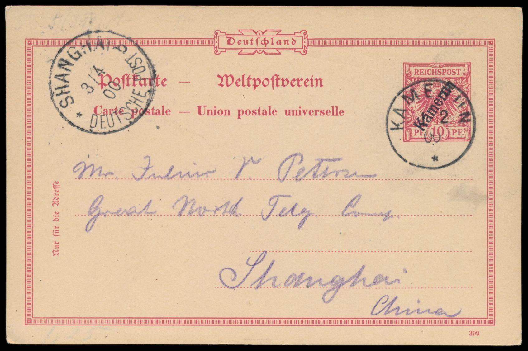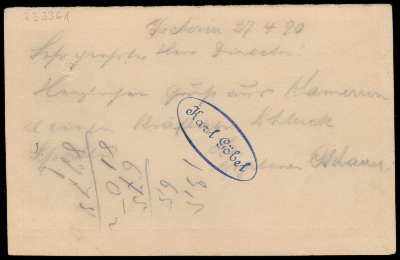 Ganzsachen-Frageteil 10 Pf. mit Stempel Viktoria (Kamerun-Gebiet) 27.4.90 nach Darmstadt, auf Pfennig-Ausgabe seltener Stempel, schwacher senkrechter Mittelbug, Bedarf