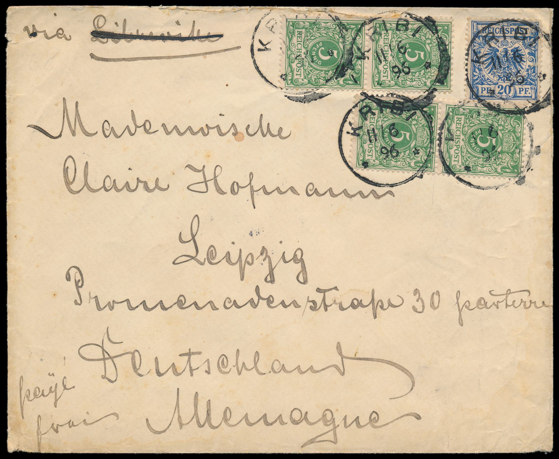 Vorläufer 4 x 5 Pf. (2 Marken kleine Mängel) und 20 Pf. (Eckbug rechts oben) auf Brief 2. Gewicht (16 bis 30 g) mit Stempel Kribi 11.6.96 nach Leipzig, Ankunftstempel 3.8.96, ungewöhnliche Frankatur-Kombination, leichte Alterungsspuren, Bedarf