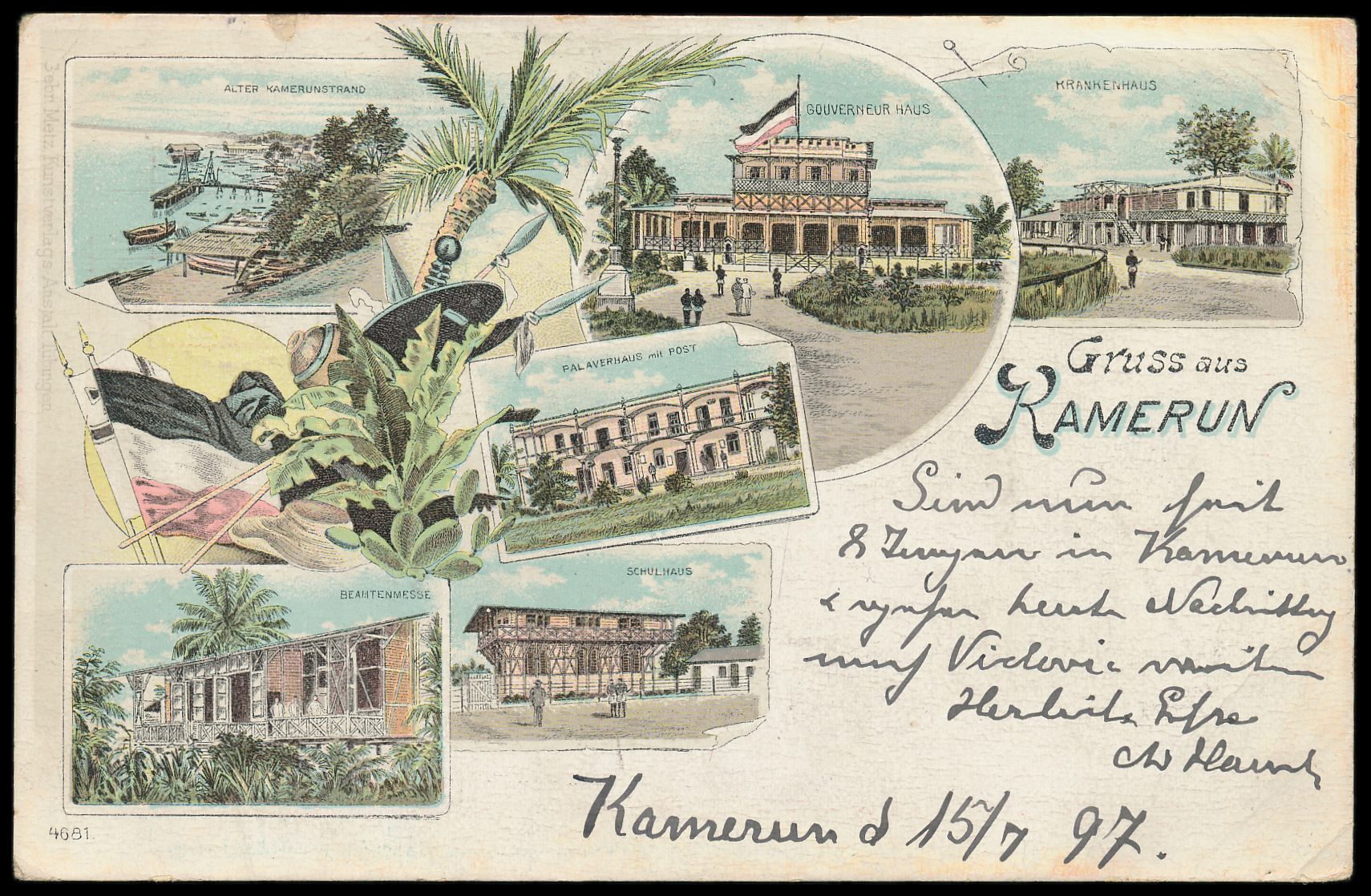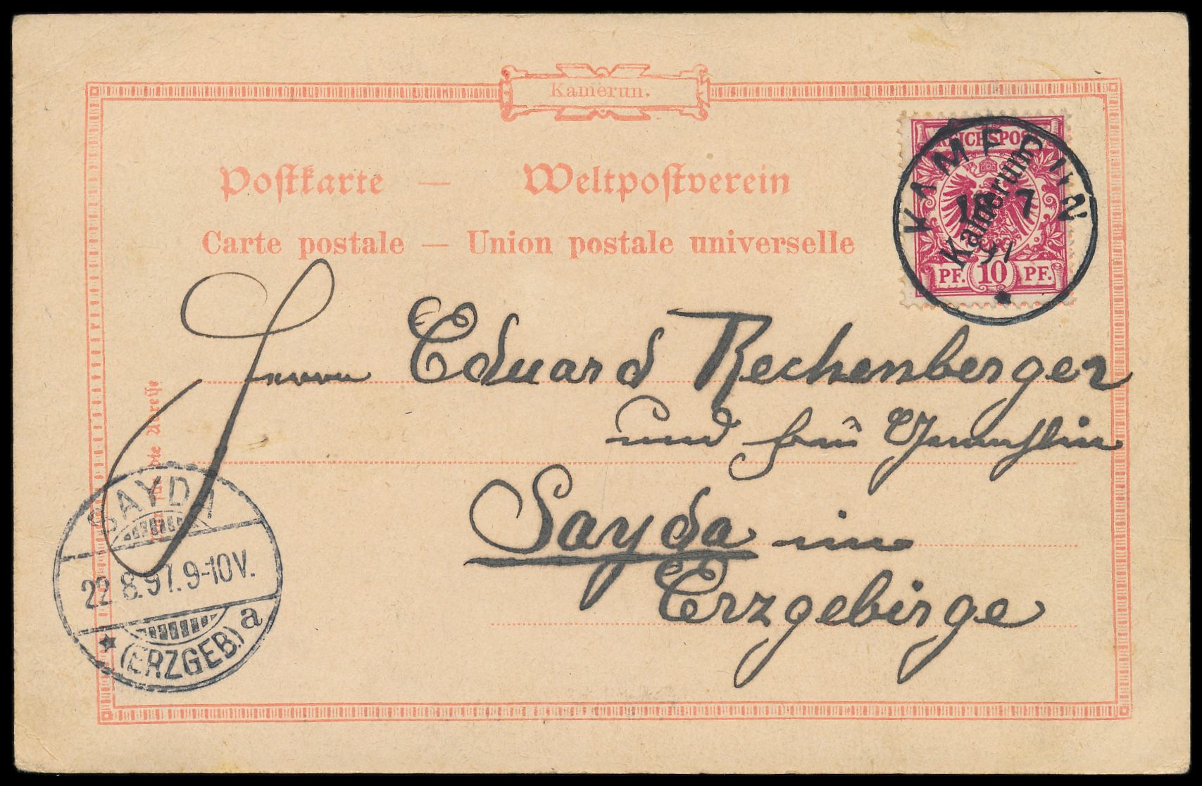 Litho-AK "Gruss aus Kamerun" mit sieben Einzelbildern, Frankatur 10 Pf., Stempel Kamerun 18.7.97, Ankunftstempel Sayda 22.8.97, Bedarf