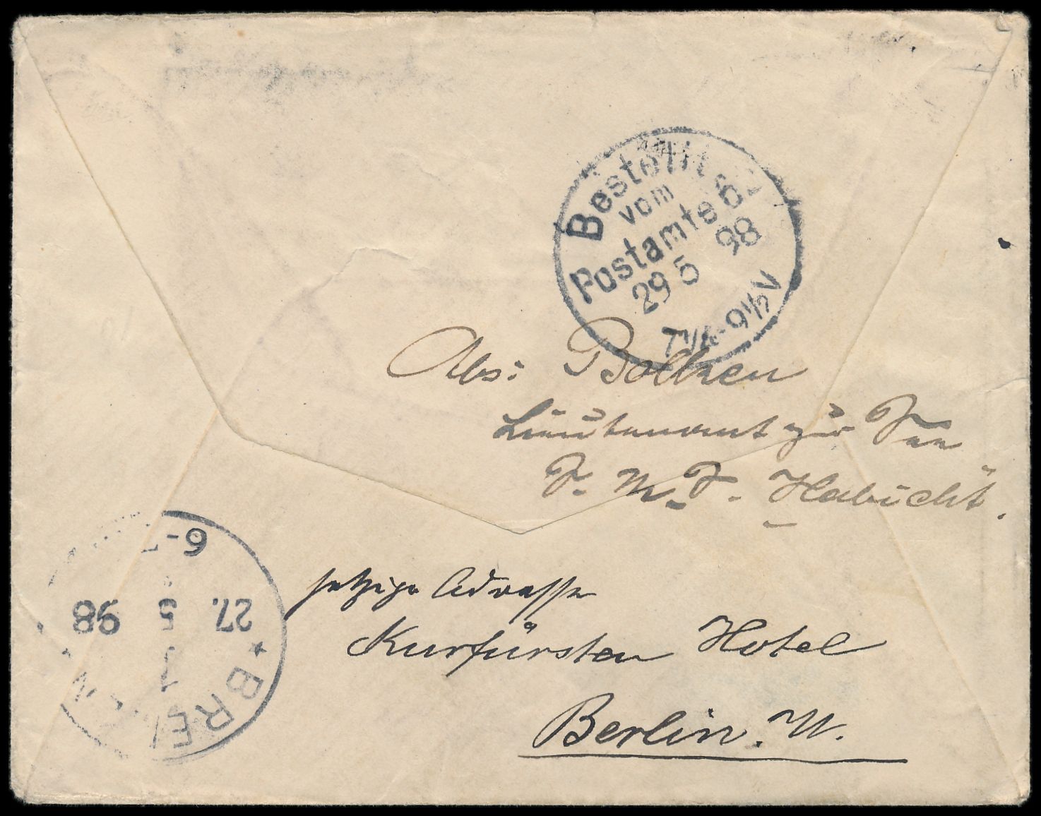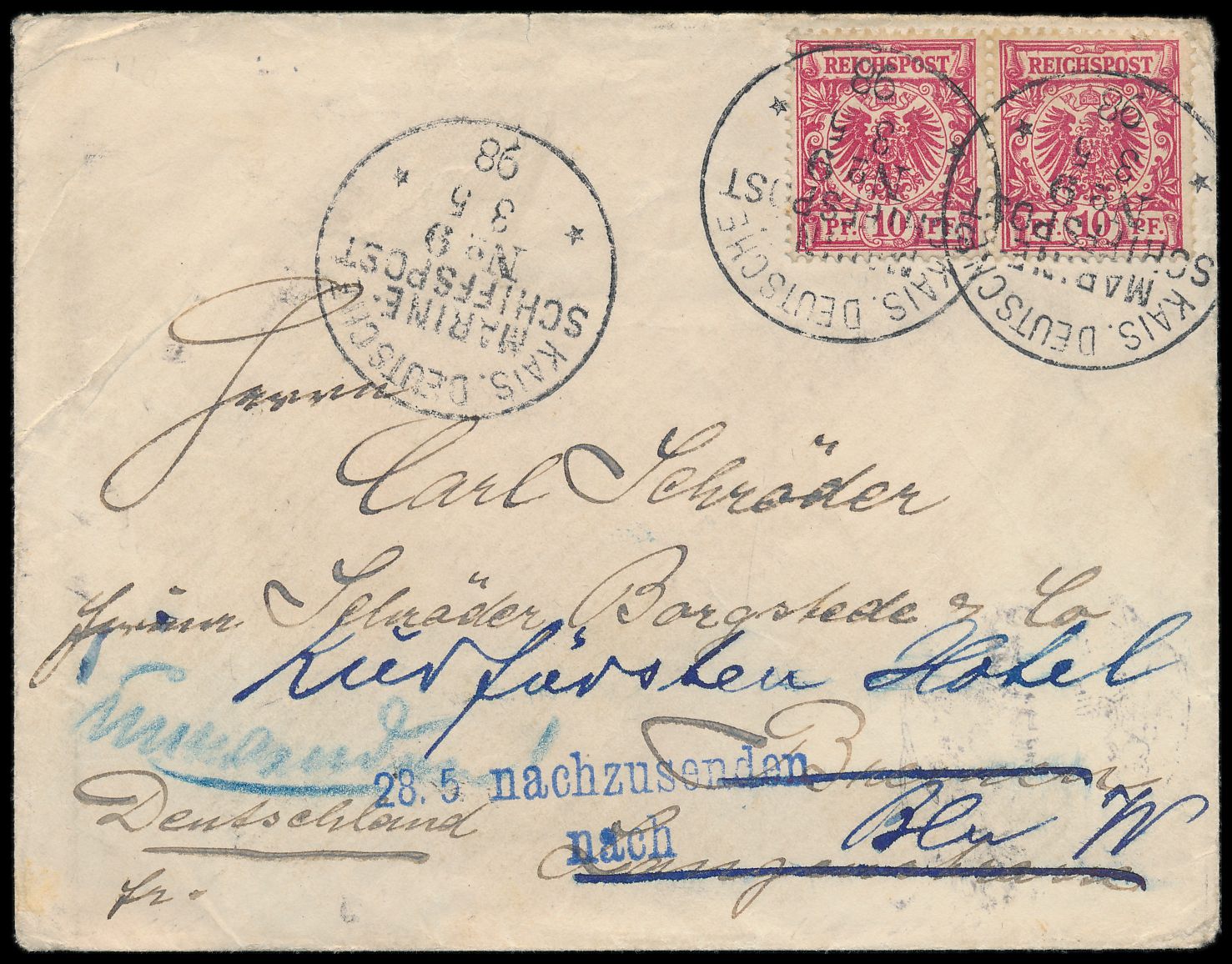 Stempel MSP No. 9 3.5.98, S.M.S. Habicht in Kamerun, drei Abschläge auf Brief mit Paar 10 Pf. nach Bremen, Absenderangabe "Leutnant z. See Bolken ...", Haller-Ankunft-Maschinenstempel Bremen 1 27.5.98, nachgesandt nach Berlin, Ankunftstempel 29.5.98, Bedarf