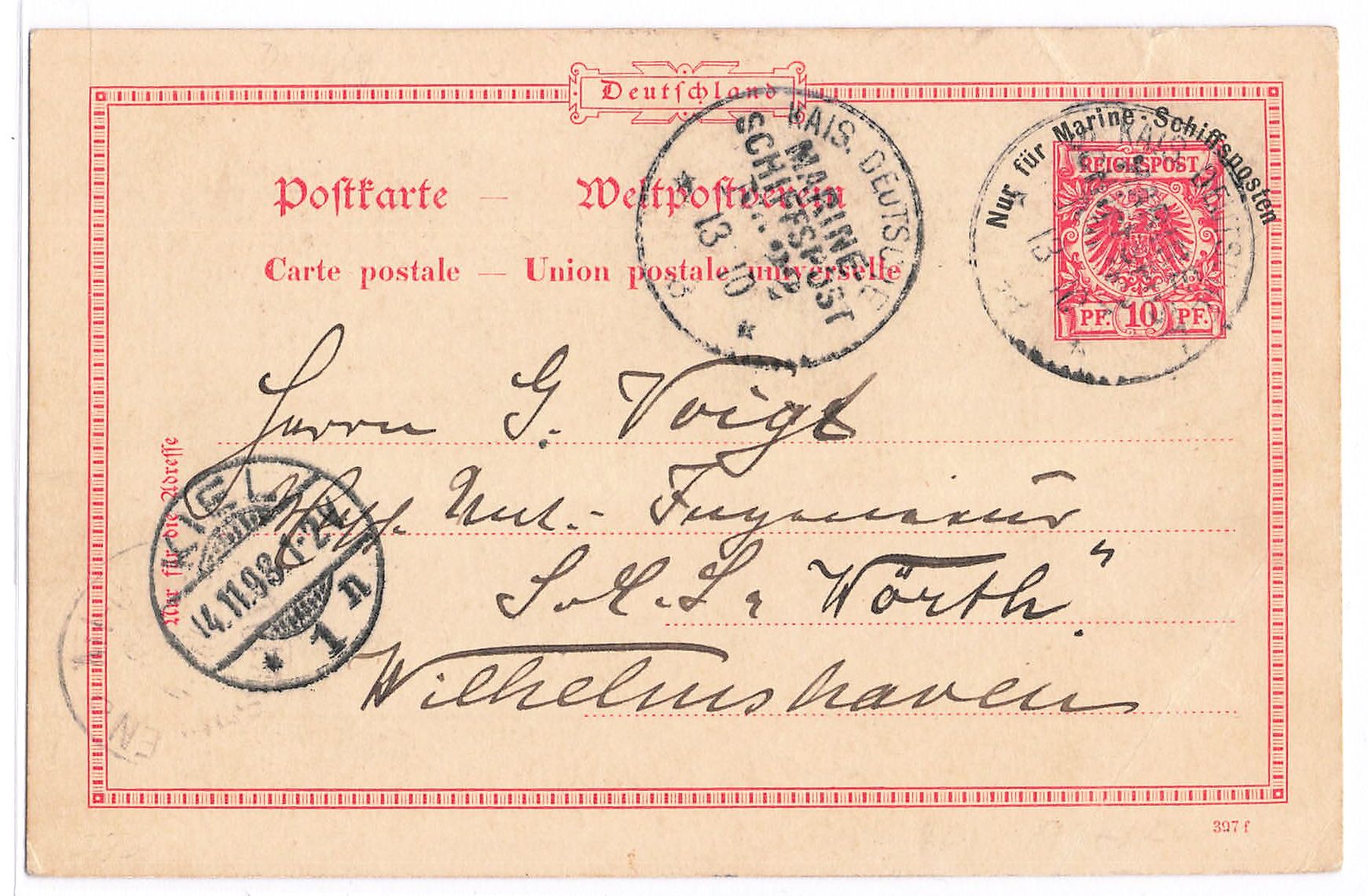 Stempel MSP No. 22 13.10.98, S.M.S. Wolf in Kamerun, zwei Abschläge auf Marine-Schiffspost-Ganzsache an S.M.S. Wörth in Wilhelmshaven, Ankunftstempel Wilhelmshaven (schwach) und Kiel 14.11.98, schwacher Eckbug rechts oben, Bedarf
