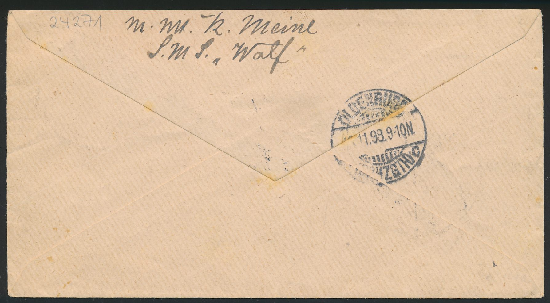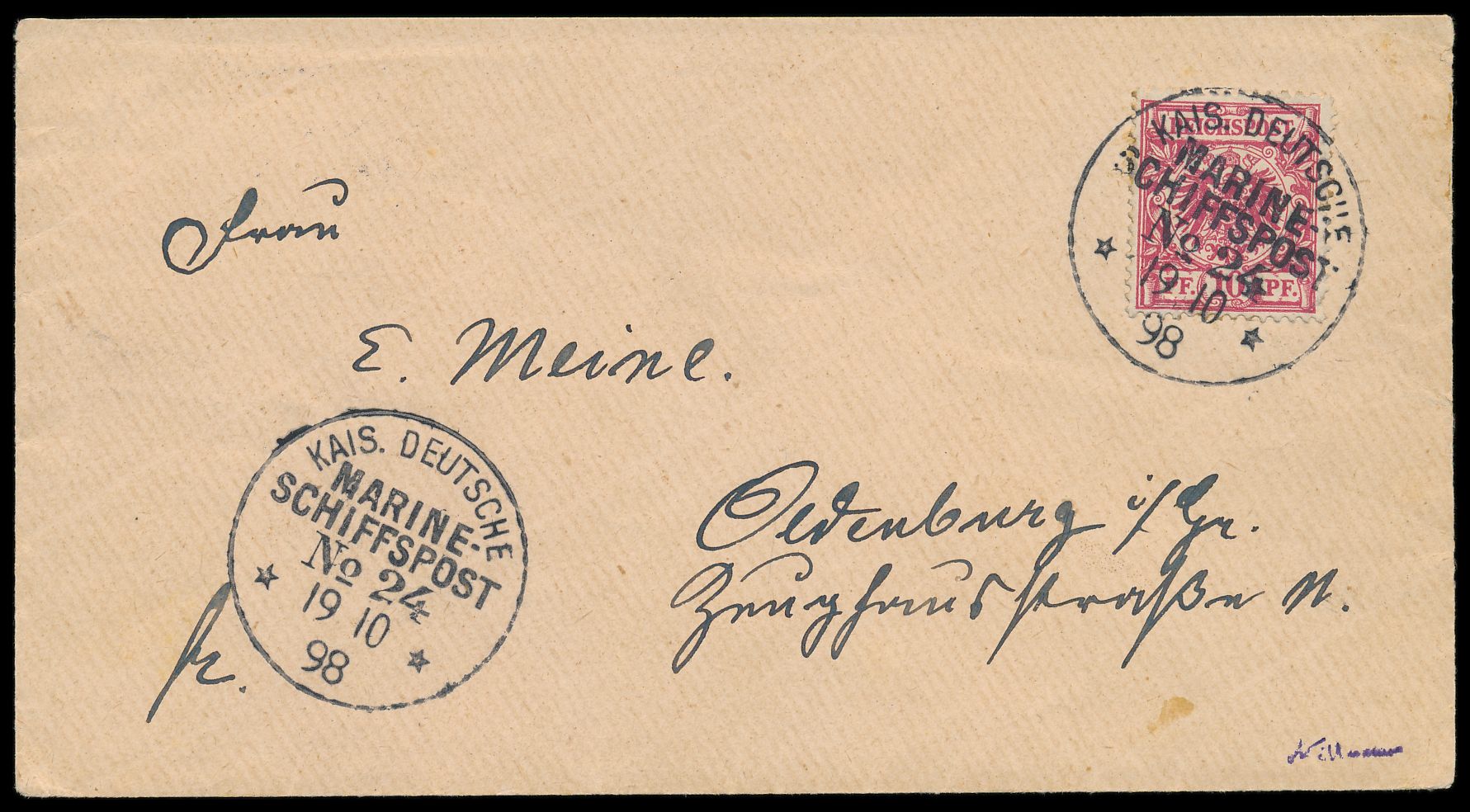 Stempel MSP No. 24 19.10.98, Dampfer Lulu Bohlen auf der Fahrt nach Kamerun, Ablösungstransport für die Kriegsschiffe auf der Westafrikanischen Station, zwei Stempelabschläge auf Brief mit Dt. Reich 10 Pf. nach Oldenburg, rückseitig Absenderangabe "... S.M.S. Wolf", Ankunftstempel 16.11.98, Bedarf