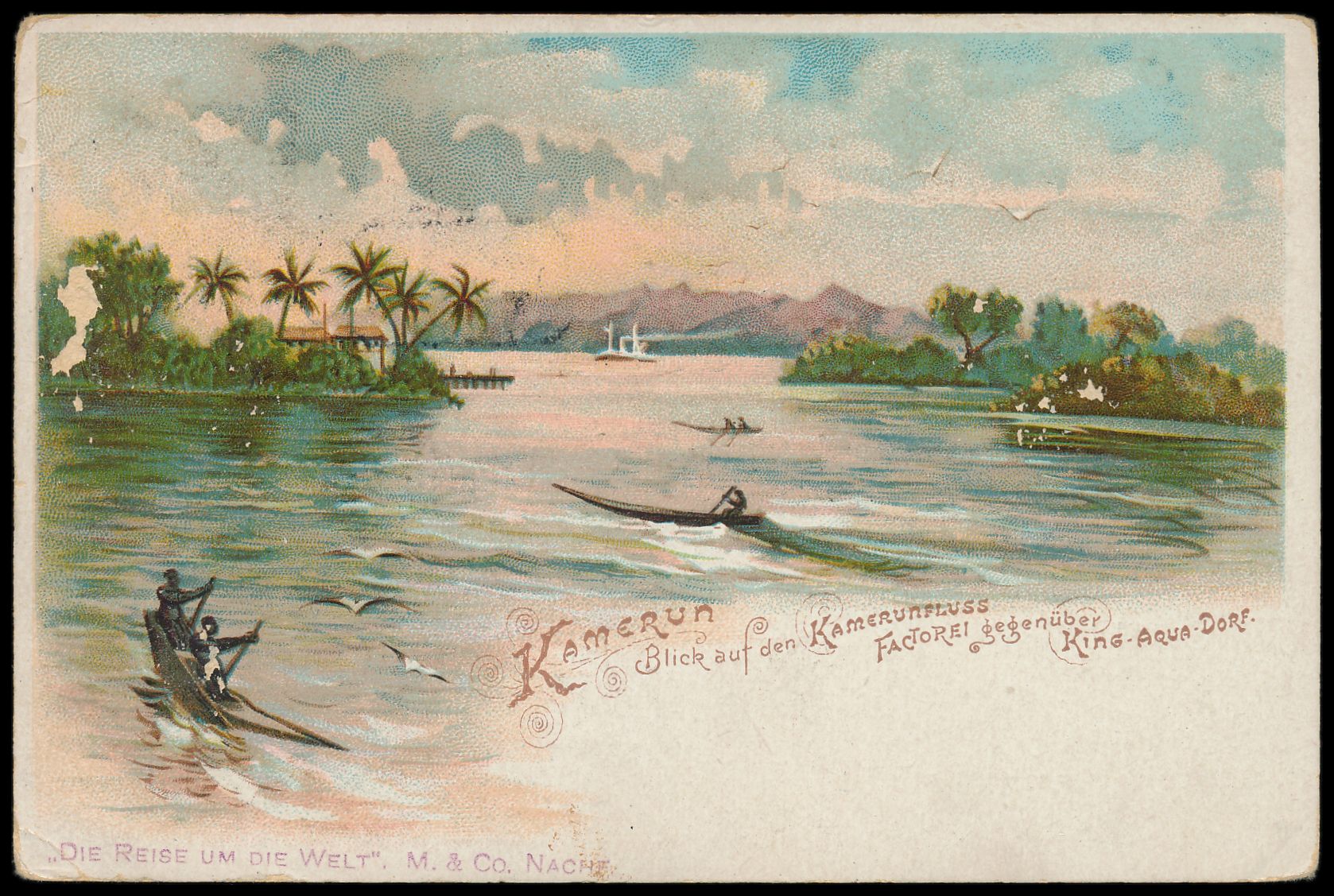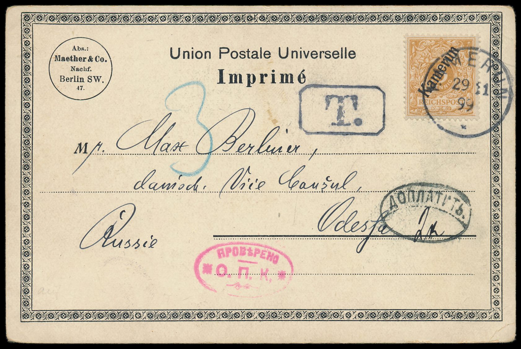 Einzelfrankatur 3 Pf. mit besserer Farbe lebhaftbraunocker auf Litho-AK "Blick auf den Kamerunfluss" (Reklame der Fa. Maether & Co. Berlin) nach Odessa, Stempel Kamerun 29.11.99, unterfrankiert, T.-Stempel, handschriftlich 3 Pf., russischer Doplatit-Stempel und handschriftlich Nachgebühr 2 Kop.