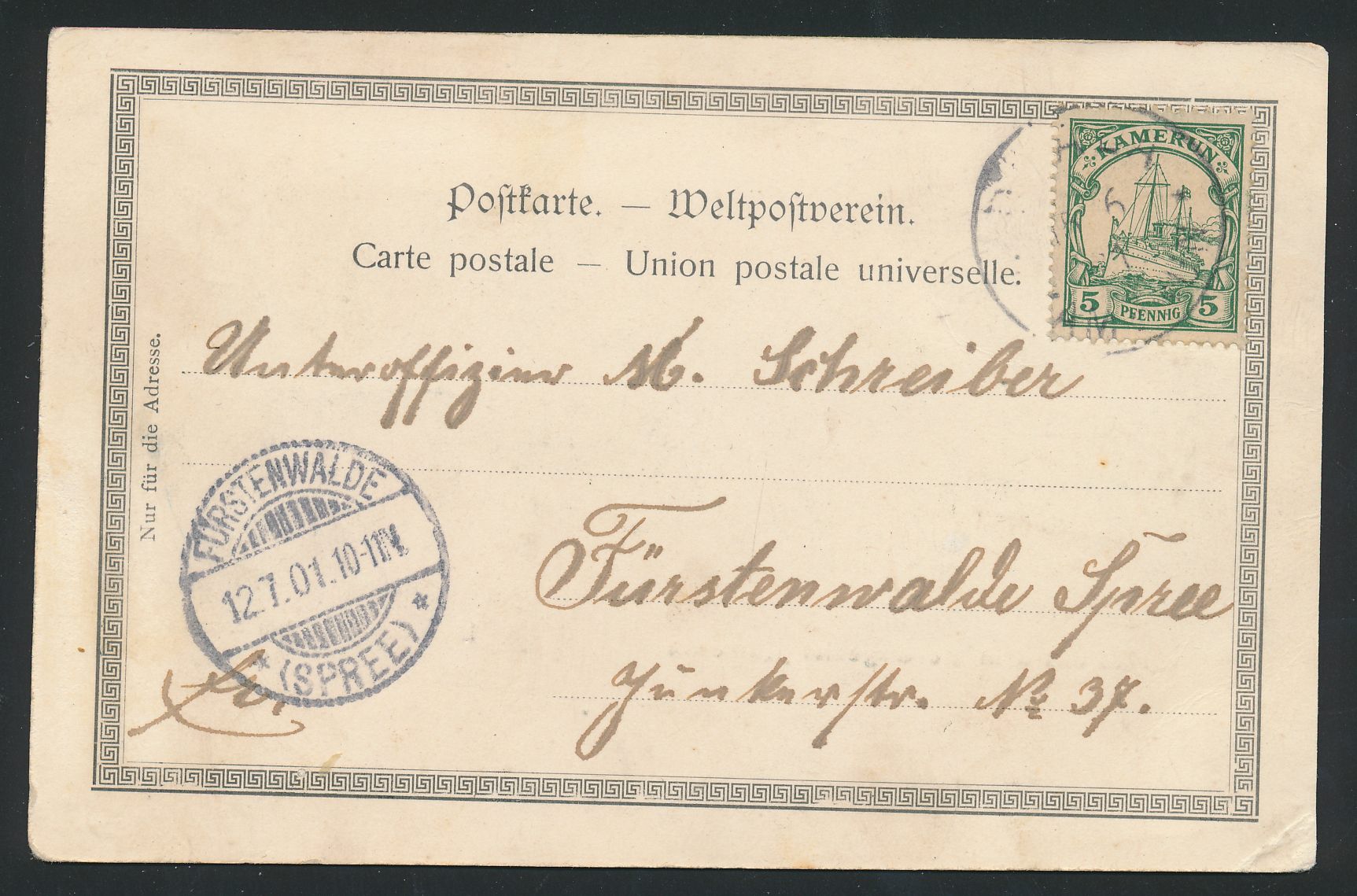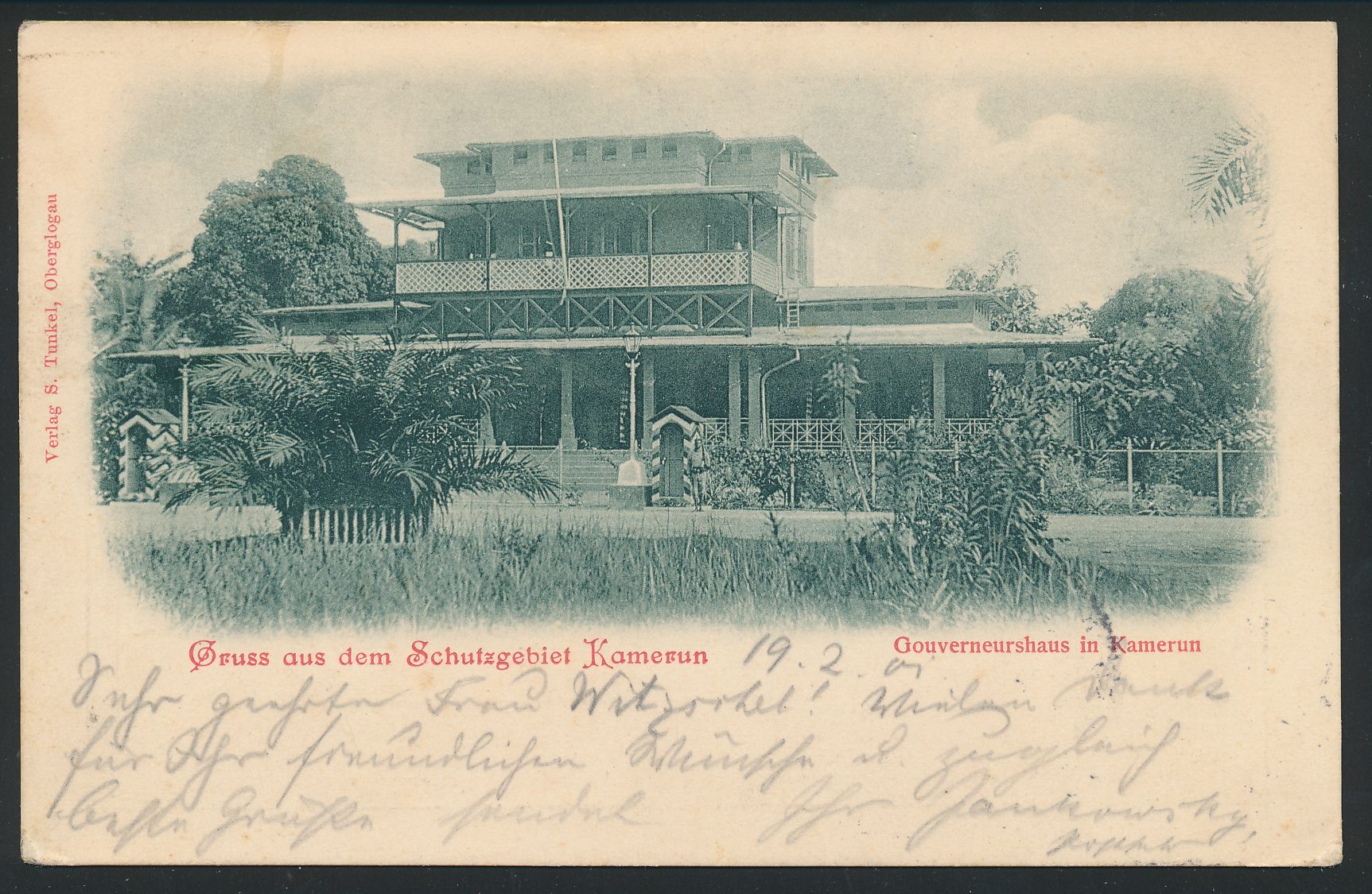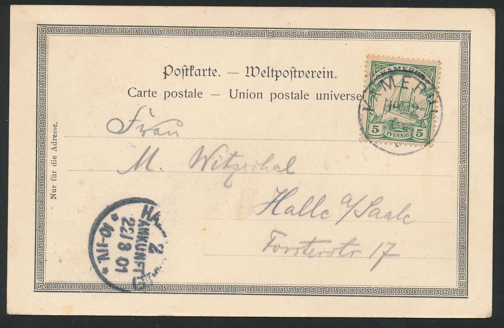 Ansichtskarte Gouverneurshaus in Kamerun, Frankatur 5 Pf. Schiffausgabe, Stempel Kamerun 19.2.01, auf Schiffausgabe nicht häufig, nach Halle, Ankunftstempel 22.3.01, Bedarf