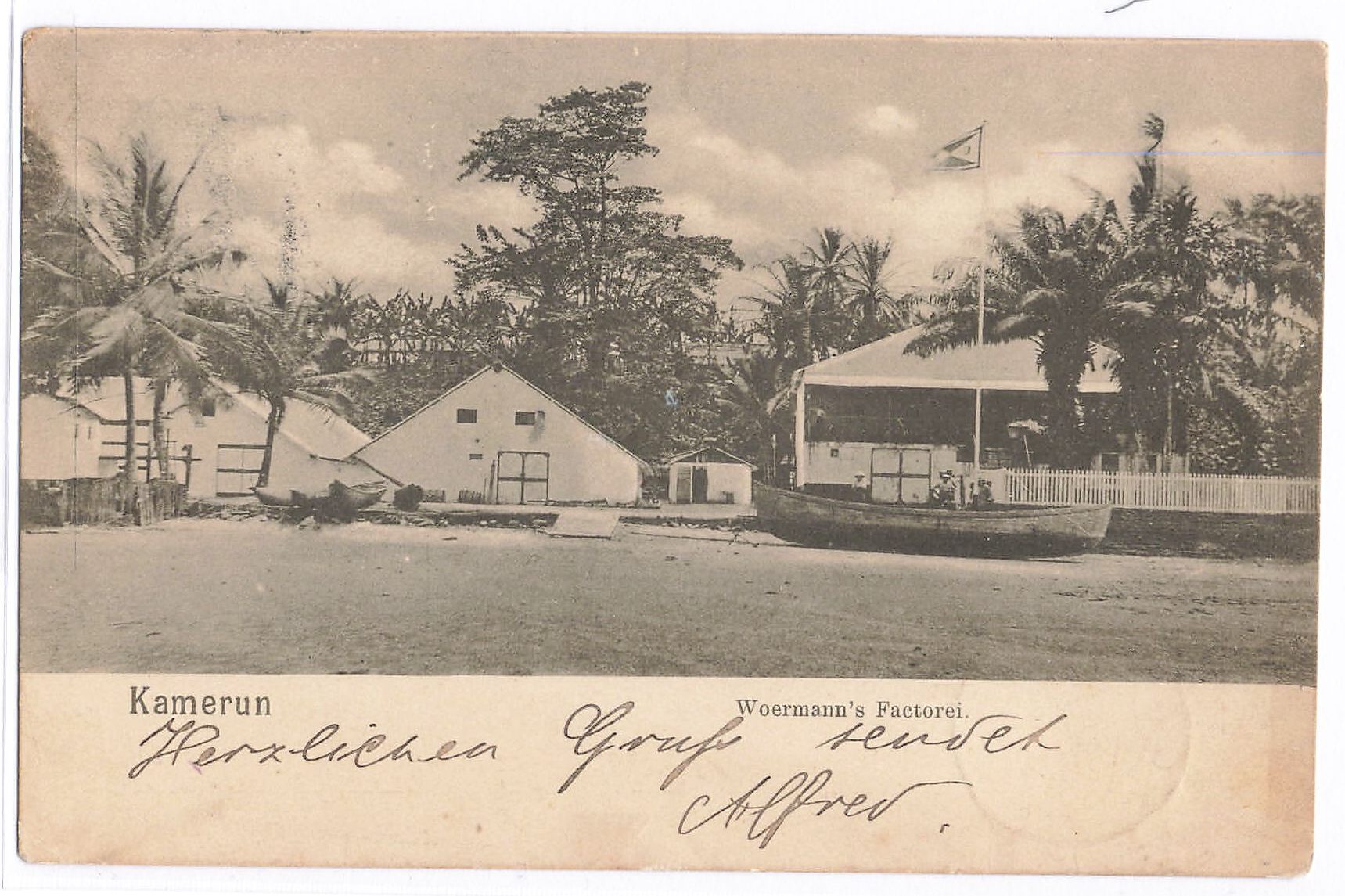 Ansichtskarte Woermann's Faktorei, ohne Verlag-Angabe, Frankatur 5 Pf., Stempel Kamerun 10.4.01, nach Horst (Ruhr), Ankunftstempel 18.5.01, nachgesandt nach Elberfeld, Ankunftstempel 18.5.01, Bedarf
