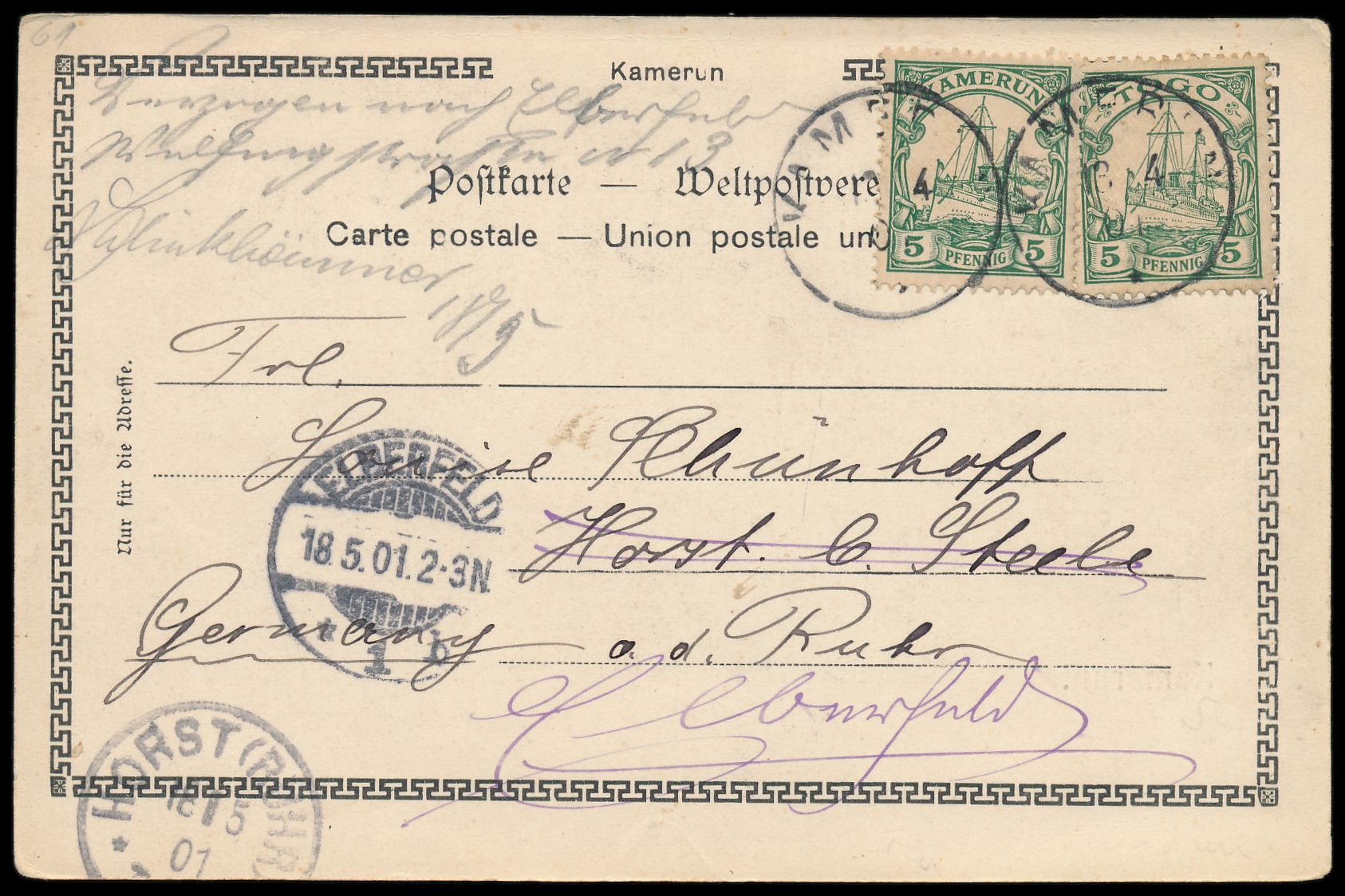 Mischfrankatur Togo 5 Pf. und Kamerun 5 Pf. mit Stempel Kamerun 13.4.01 auf Ansichtskarte "Kamerun" nach Horst (Ruhr), Ankunftstempel 18.5.01, nachgesandt nach Elberfeld, Ankunftstempel 18.5.01, Bedarf
