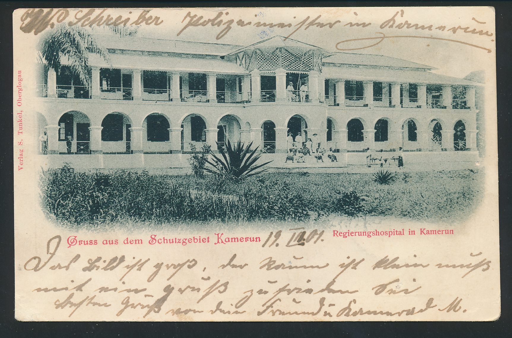 Ansichtskarte Regierungshospital in Kamerun, Verlag S. Tunkel, Oberglogau, Frankatur 5 Pf., undeutlicher Stempel Duala 15.6.01, Ankunftstempel Fürstenwalde 12.7.01, Absender ist Polizeimeister W. Schreiber, Bedarf