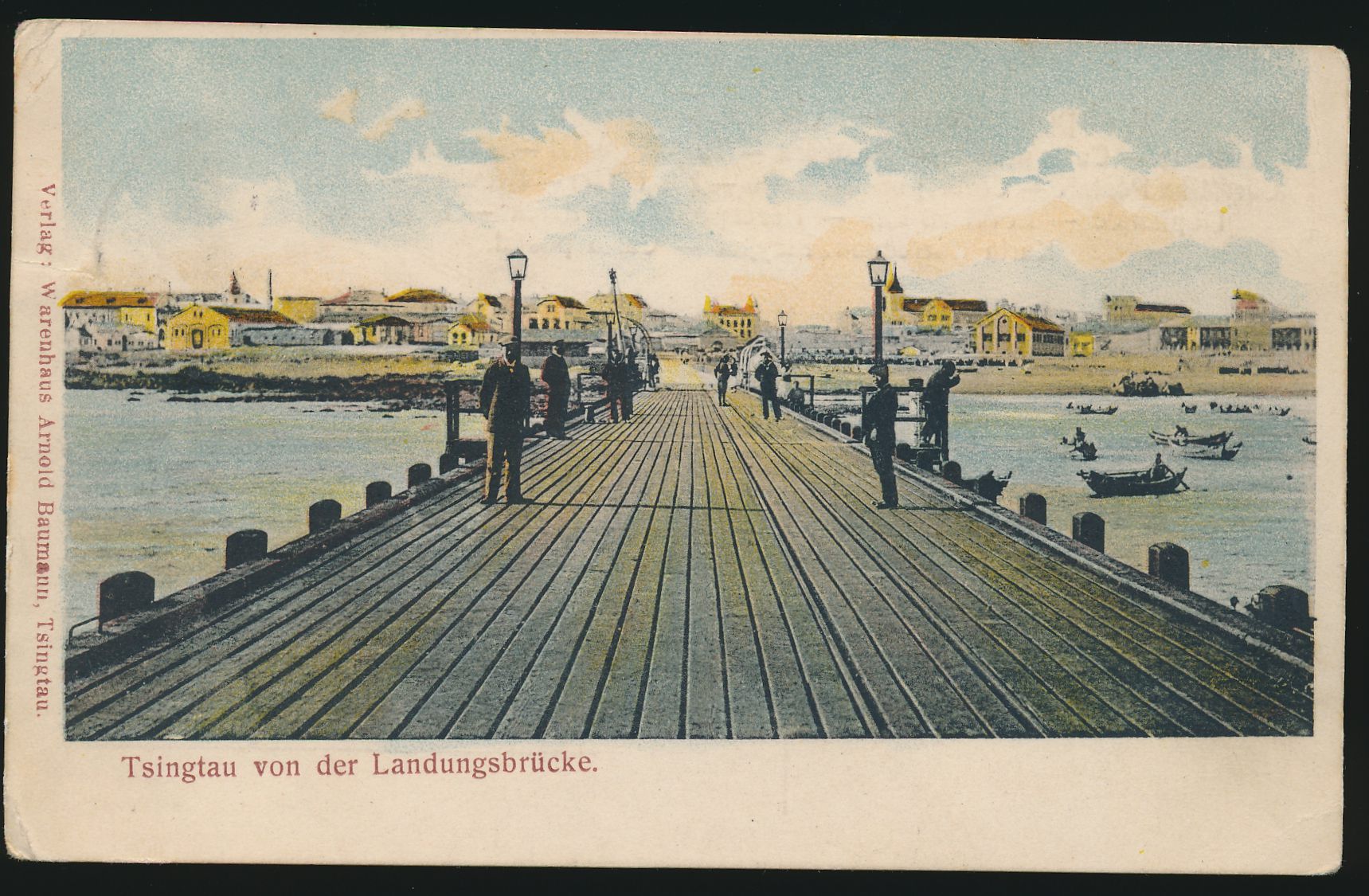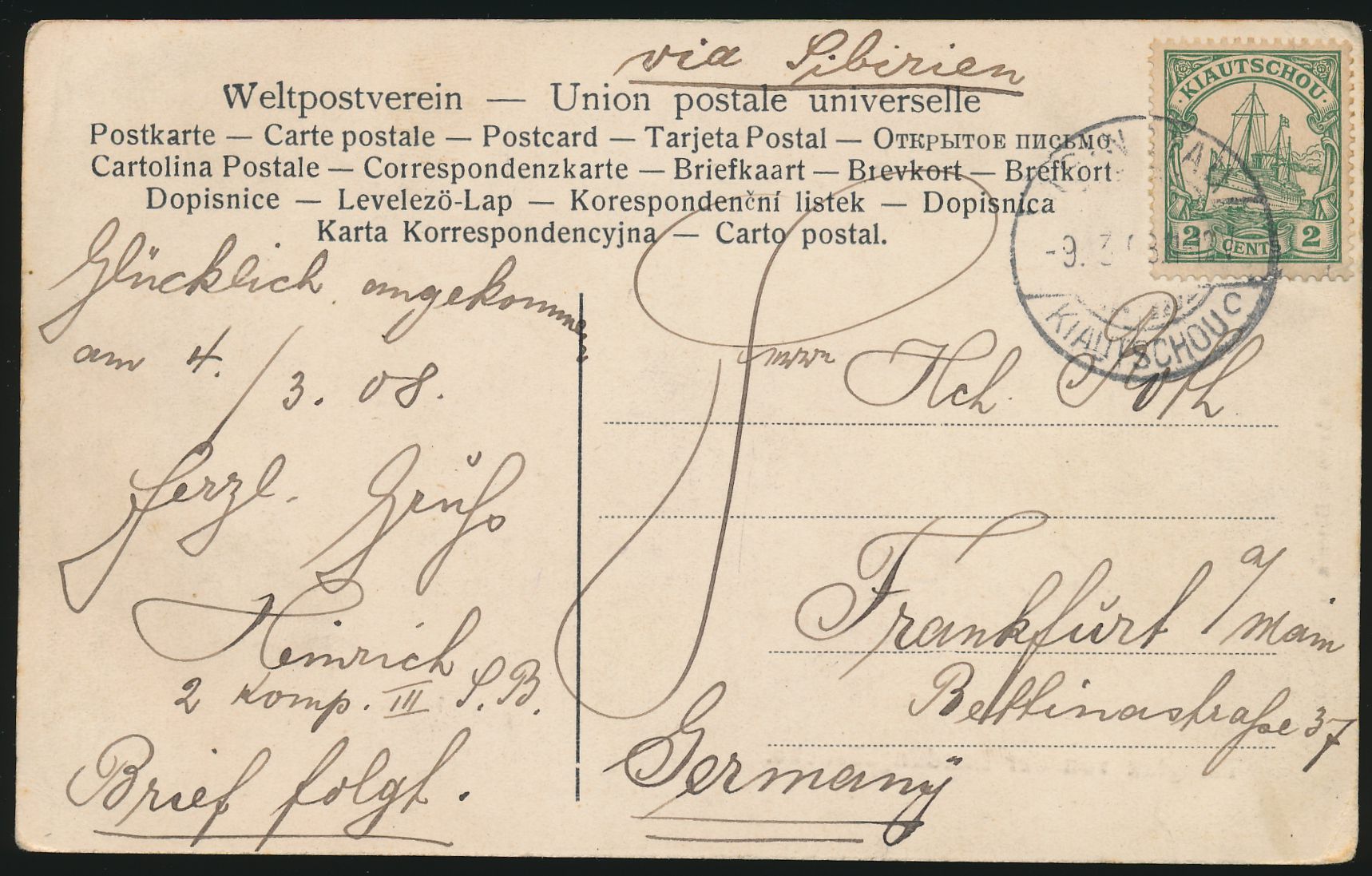 kolorierte Ansichtskarte Tsingtau von der Landungsbrücke, Verlag Warenhaus Arnold Baumann, Tsingtau, Frankatur 2 C., Stempel Tsingtau c 9.3.08, "via Sibirien" nach Deutschland