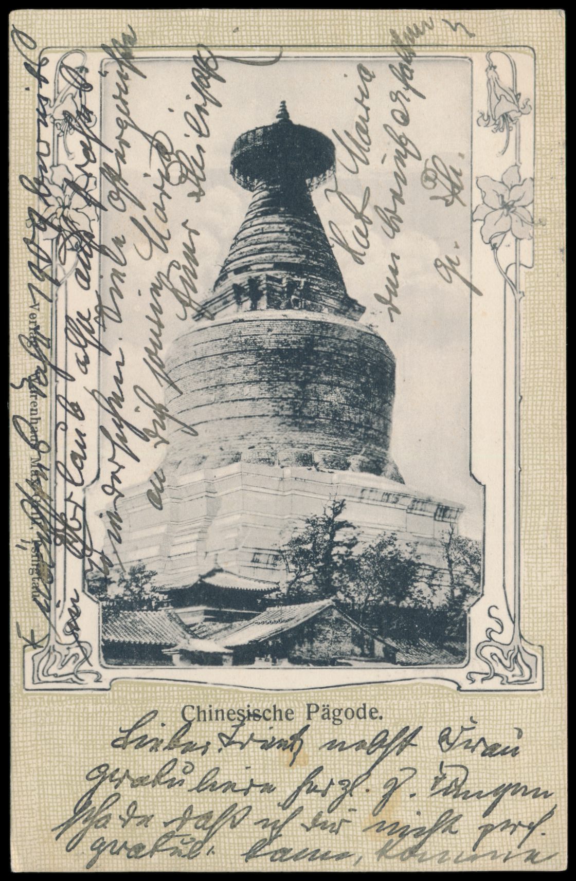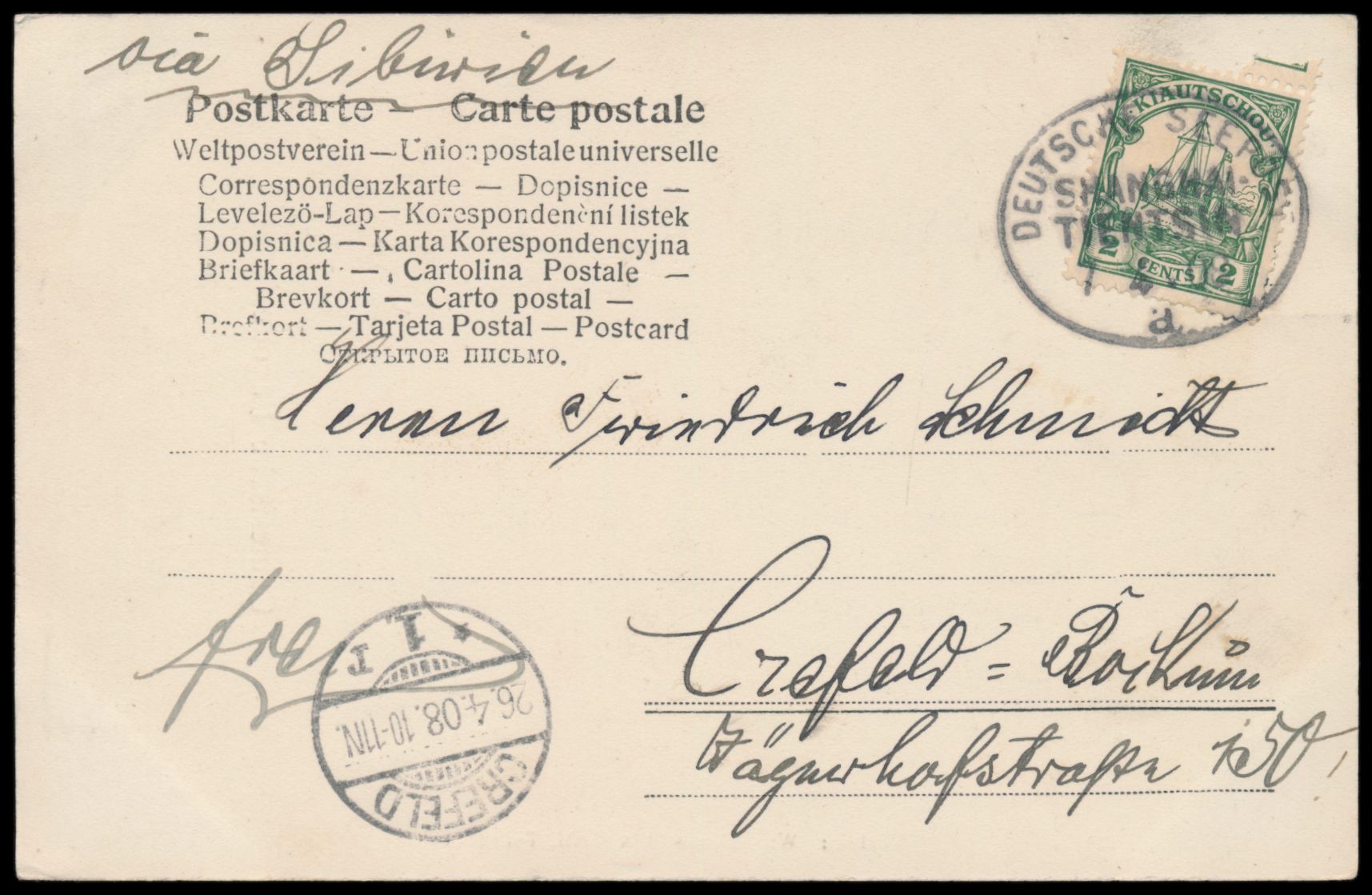 Stempel Deutsche Seepost Shanghai - Tientsin a 7.4.08 auf Ansichtskarte "Chinesische Pagode" mit Kiautschou 2 C. nach Deutschland, Leitvermerk "via Sibirien", Ankunftstempel Crefeld 26.4.08, Bedarf