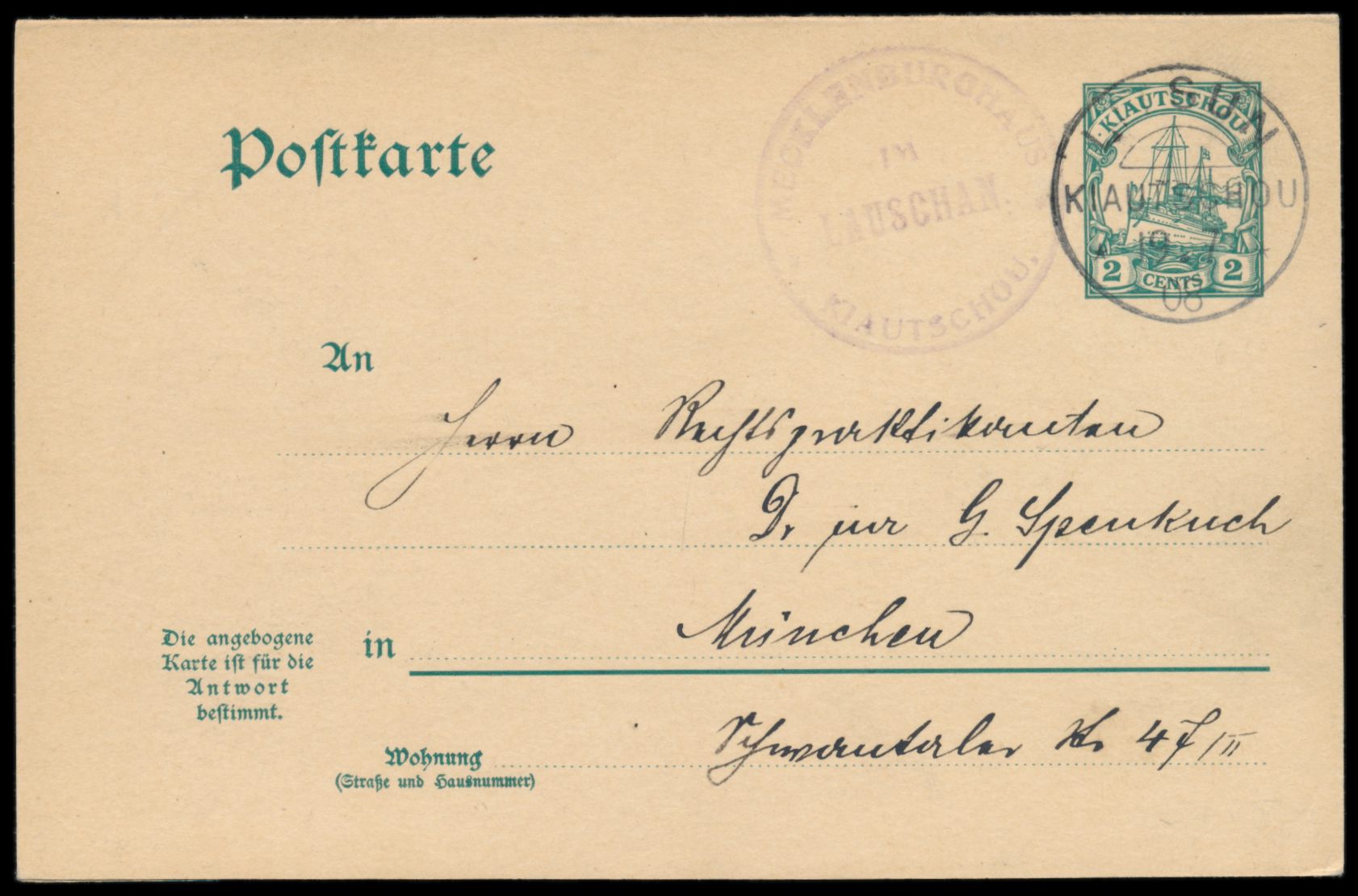 Ganzsachen-Doppelkarte 5 Pf. nach München, Stempel Litsun 19.7.08 auf beiden Teilen, Frageteil zusätzlich Nebenstempel Mecklenburghaus Im Lauschan / Kiautschou, Bedarf, Antwortteil hängt unbenutzt an
