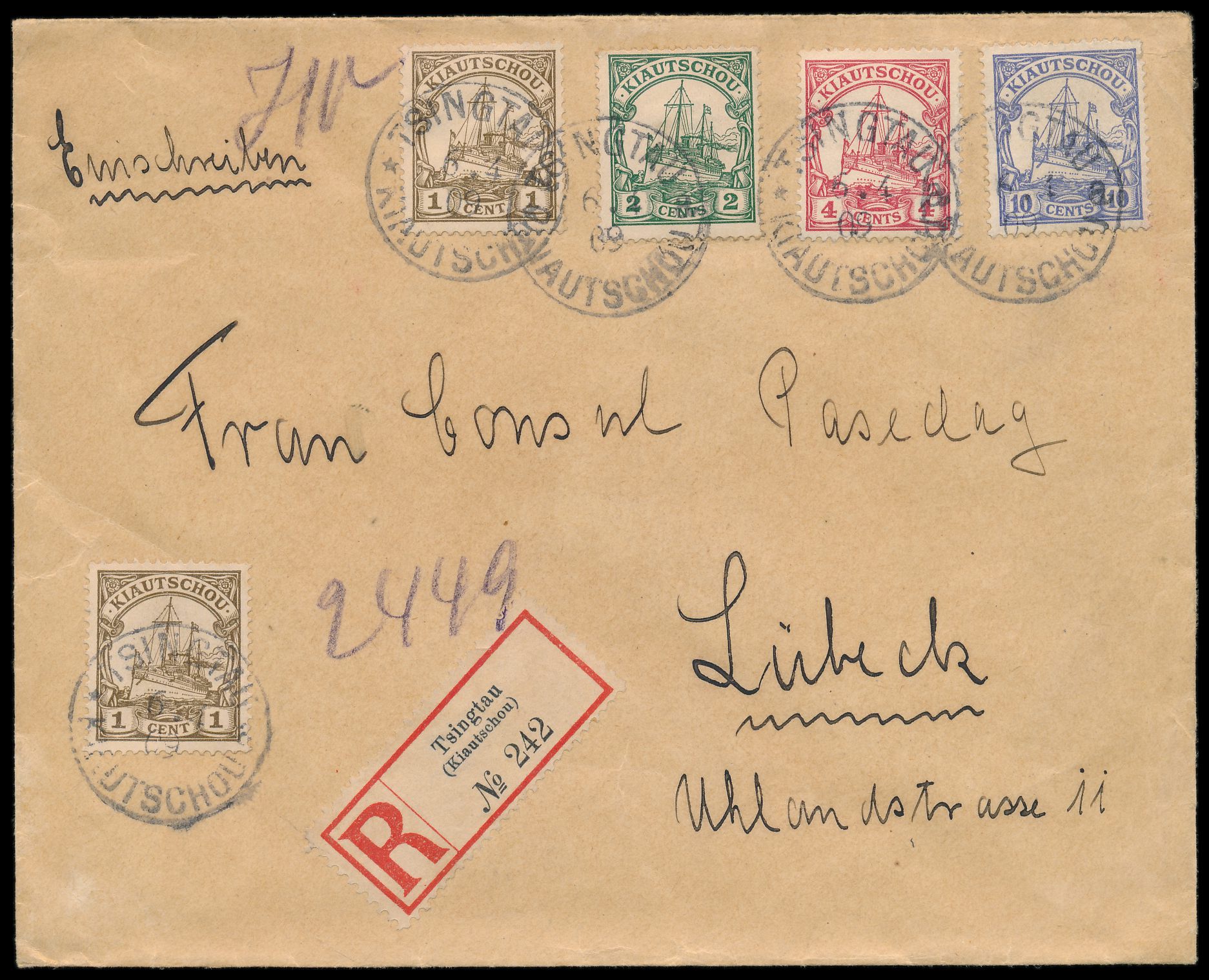 Einschreibbrief 2. Gewicht (21 bis 250 g), dekorative 18 C.-Mischfrankatur, Stempel Tsingtau a 6.4.09, R-Zettel Einfeldt Nr. 10, nach Lübeck, Absender"... S.M.S. Fürst Bismarck ...", portorichtig, Bedarf