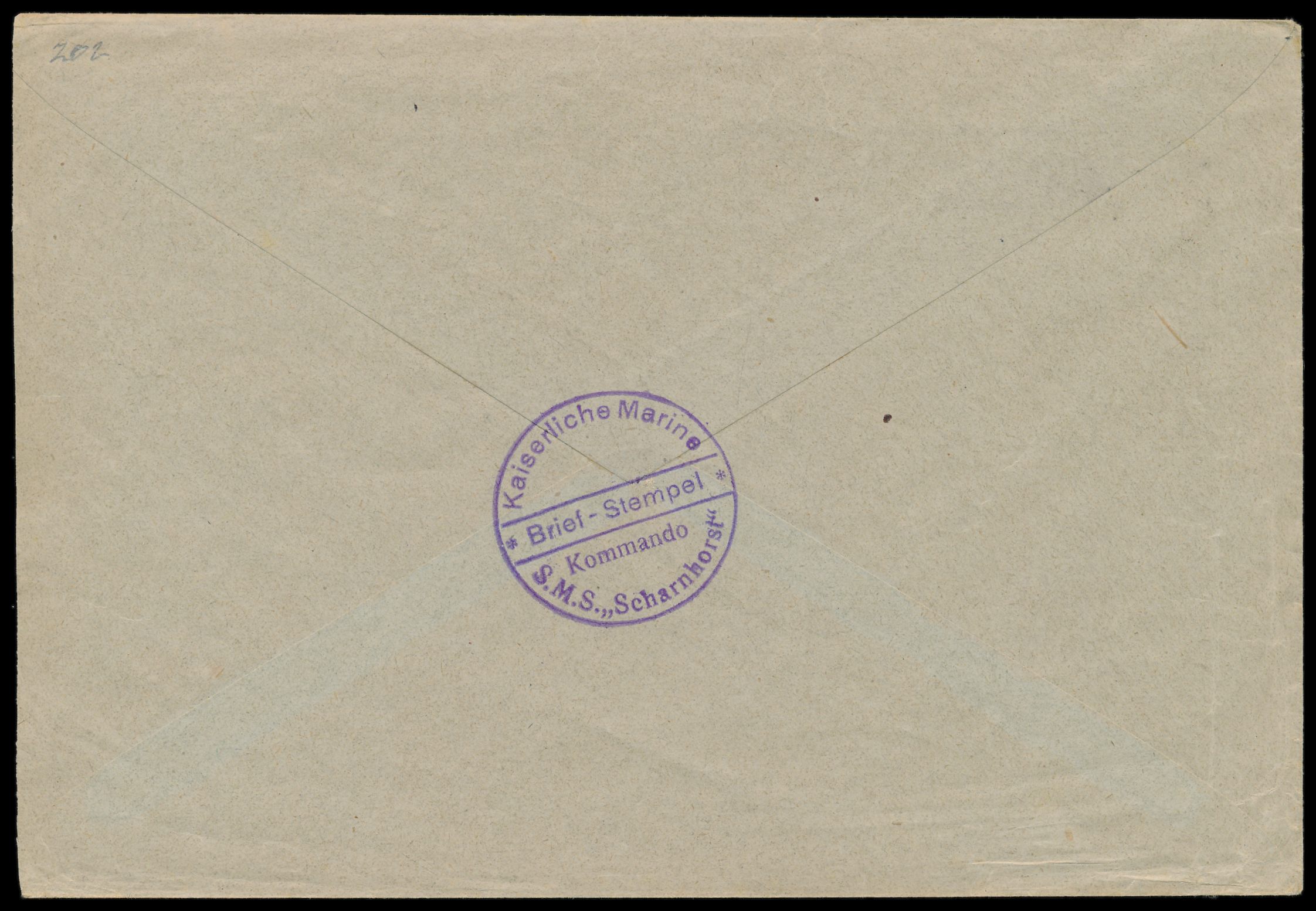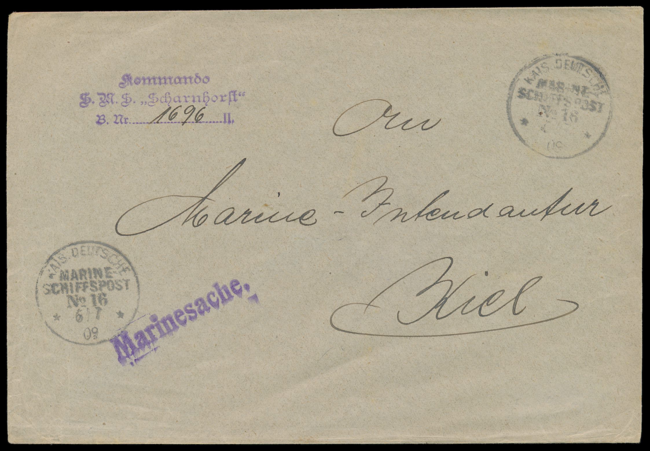Stempel MSP No. 16 6.7.09, S.M.S. Scharnhorst während der Liegezeit in Tsingtau, zwei Abschläge auf Dienstbrief "Marinesache" mit Absenderstempel und Briefstempel "Kommando S.M.S. Scharnhorst" nach Kiel