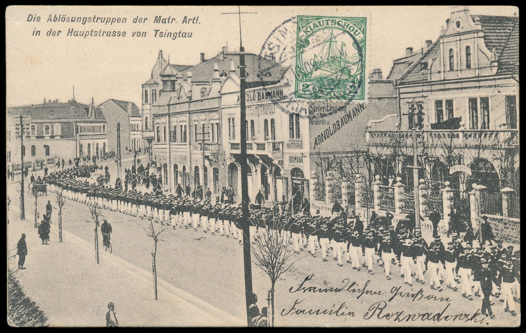 2 C. bildseitig auf Ansichtskarte "Die Ablösung der Matr. Artl. in der Hauptstrasse von Tsingtau" , Verlag Warenahaus Arnold Baumann, Tsingtau, Stempel Tsingtau c 5.10.09, nach Berlin, Bedarf