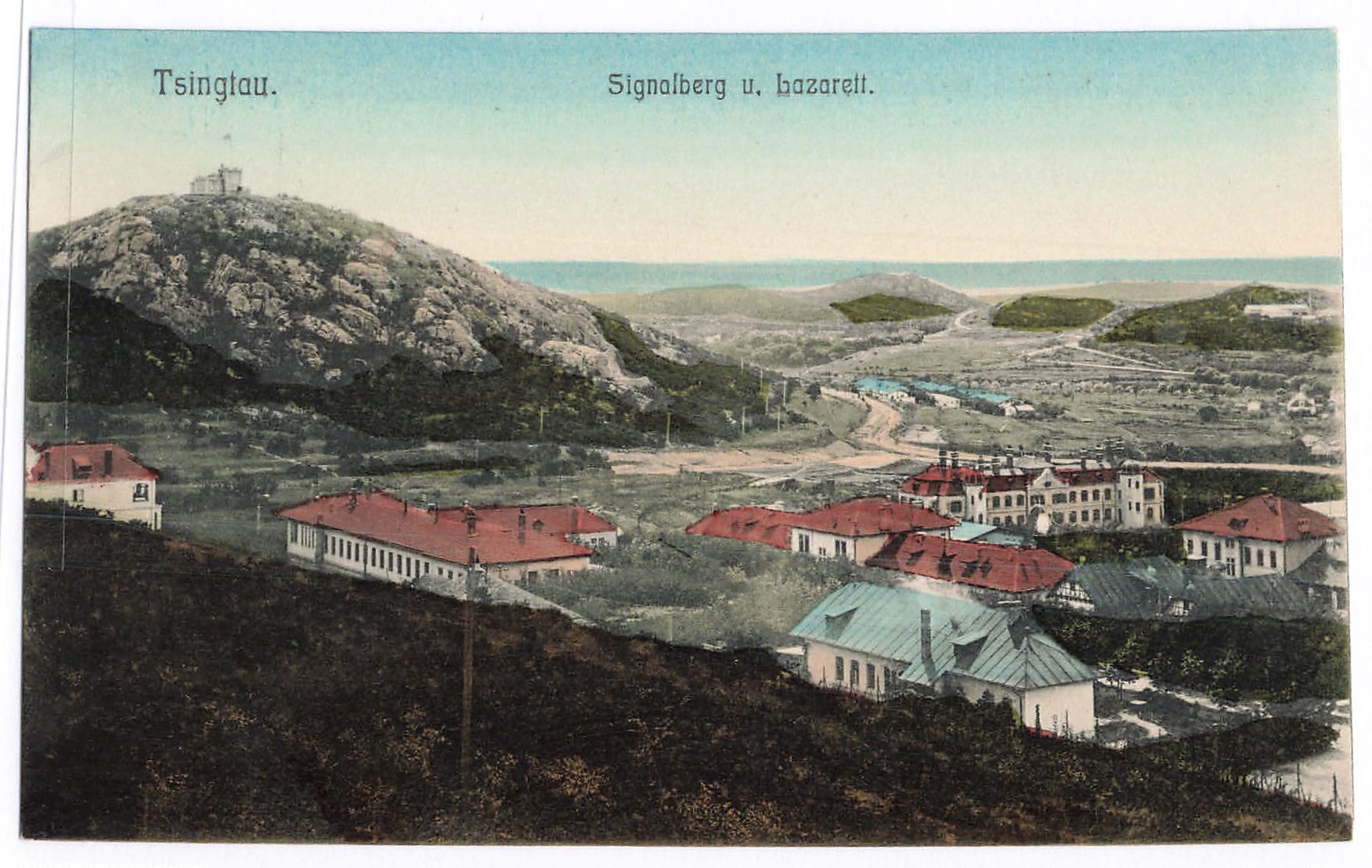 kolorierte Ansichtskarte Tsingtau - Signalberg u. Lazarett, Verlag Robert Claus, Dresden, ungebraucht, ca. 1910