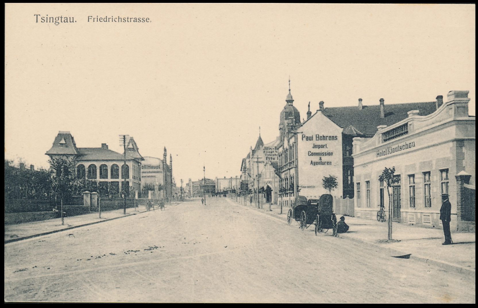 Ansichtskarte Tsingtau - Friedrichstrasse (mit Hotel Kiautschou), ohne Verlag-Angabe, ungebraucht, ca. 1910
