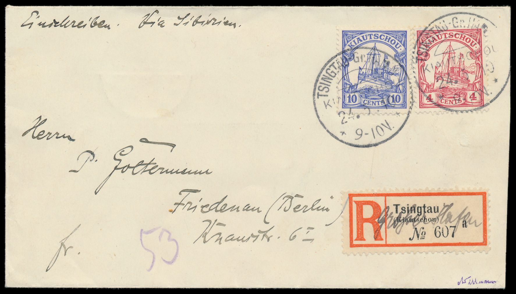 4 und 10 C. auf portorichtigem Einschreibbrief mit Stempel Tsingtau-Gr.Hafen 24.5.10 "via Sibirien" nach Deutschland, R-Zettel Tsingtau mit UB a und handschriftlicher Ergänzung "Großer Hafen", Einfeldt Nr. 1, Ankunftstempel Friedenau 8.6.10