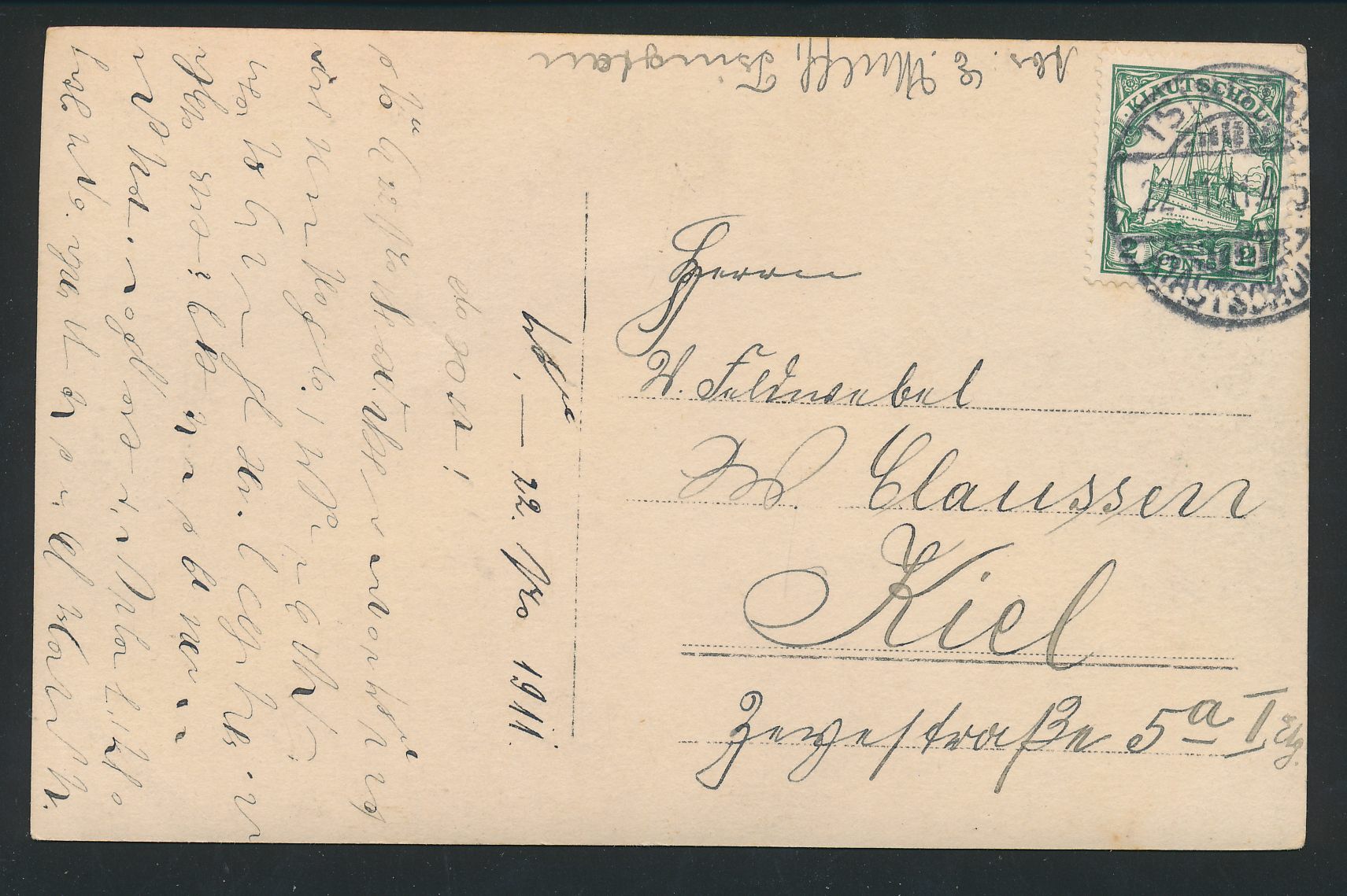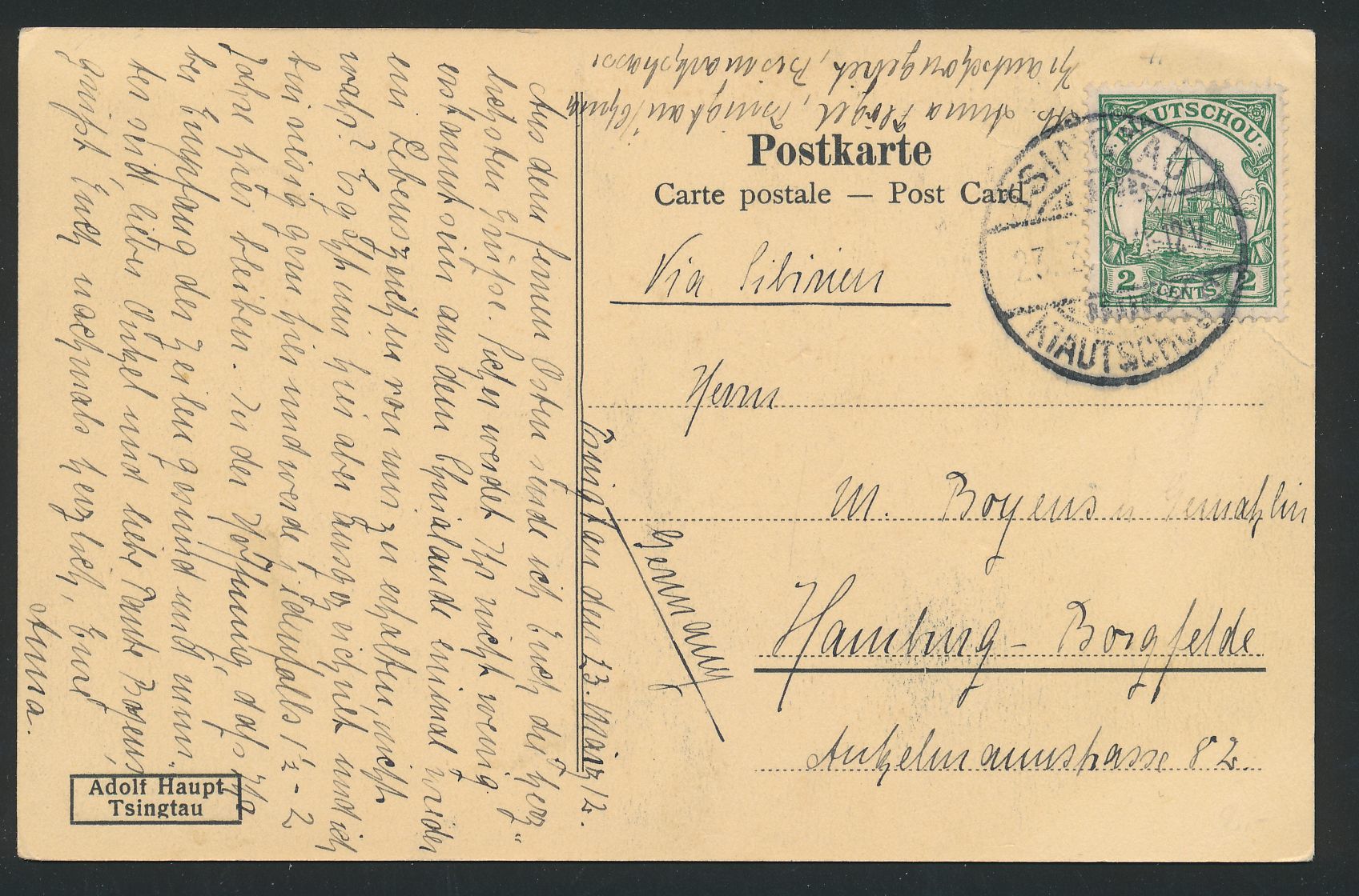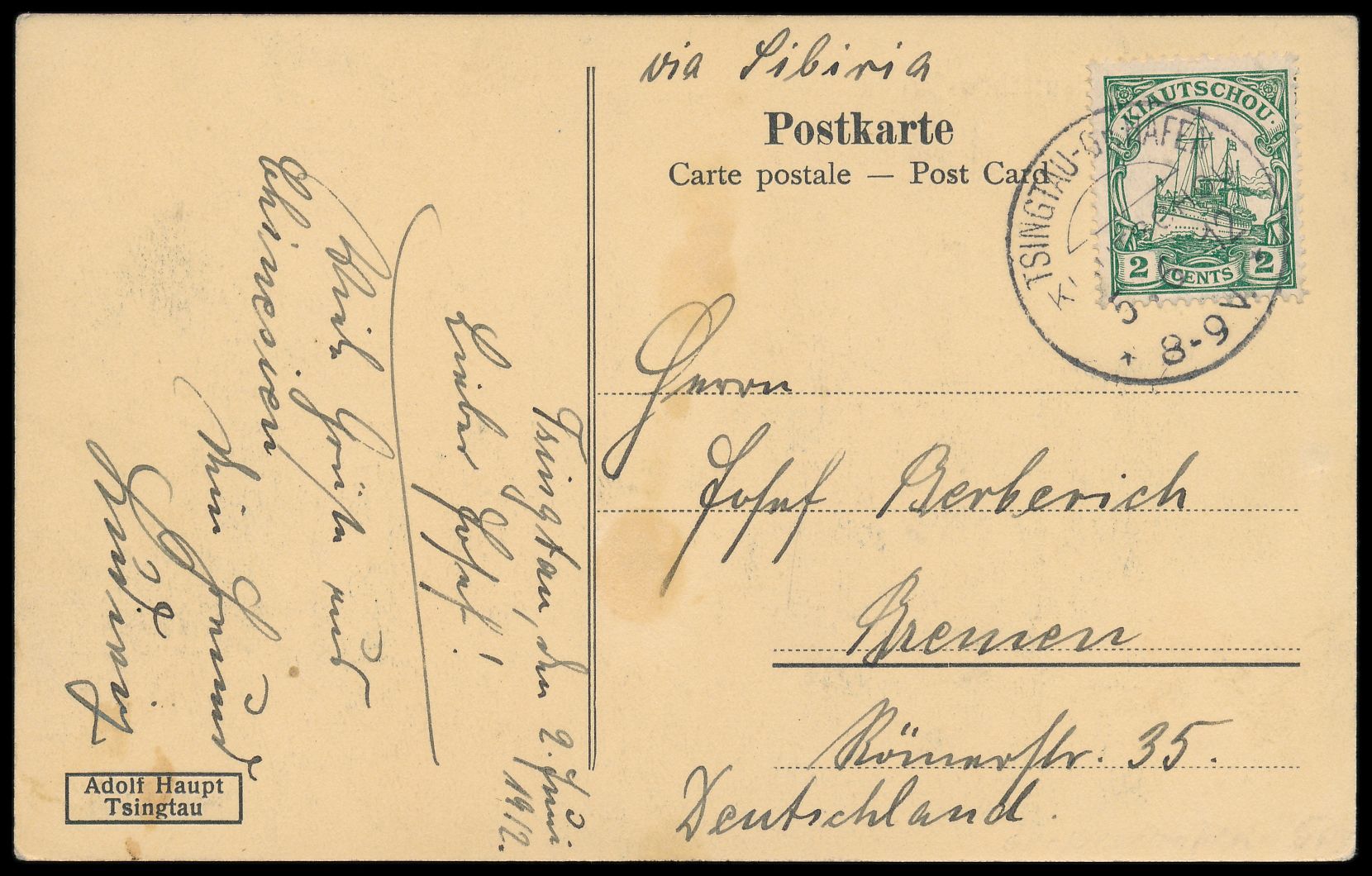 Ansichtskarte Tsingtau - Kiautschou-Straße, Verlag Adolf Haupt, Tsingtau, Frankatur 2 C., Stempel Tsingtau-Gr.Hafen 5.6.12, nach Bremen, Bedarf