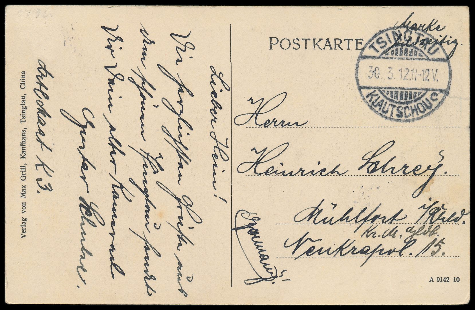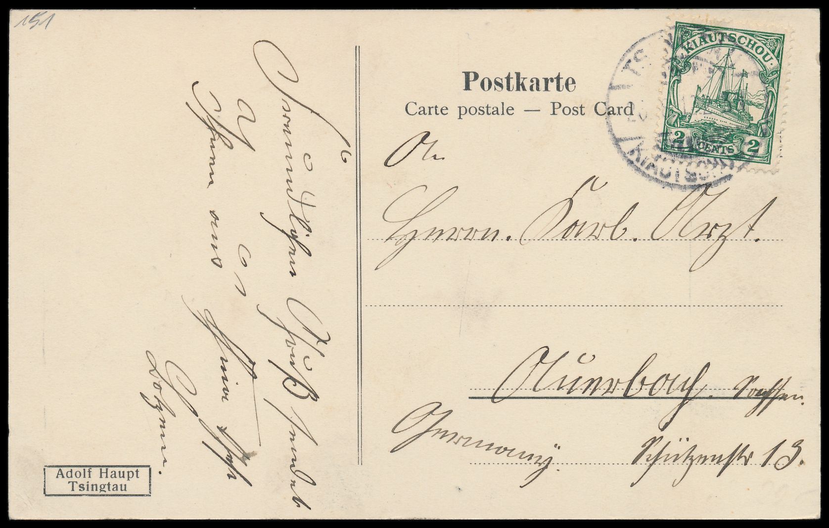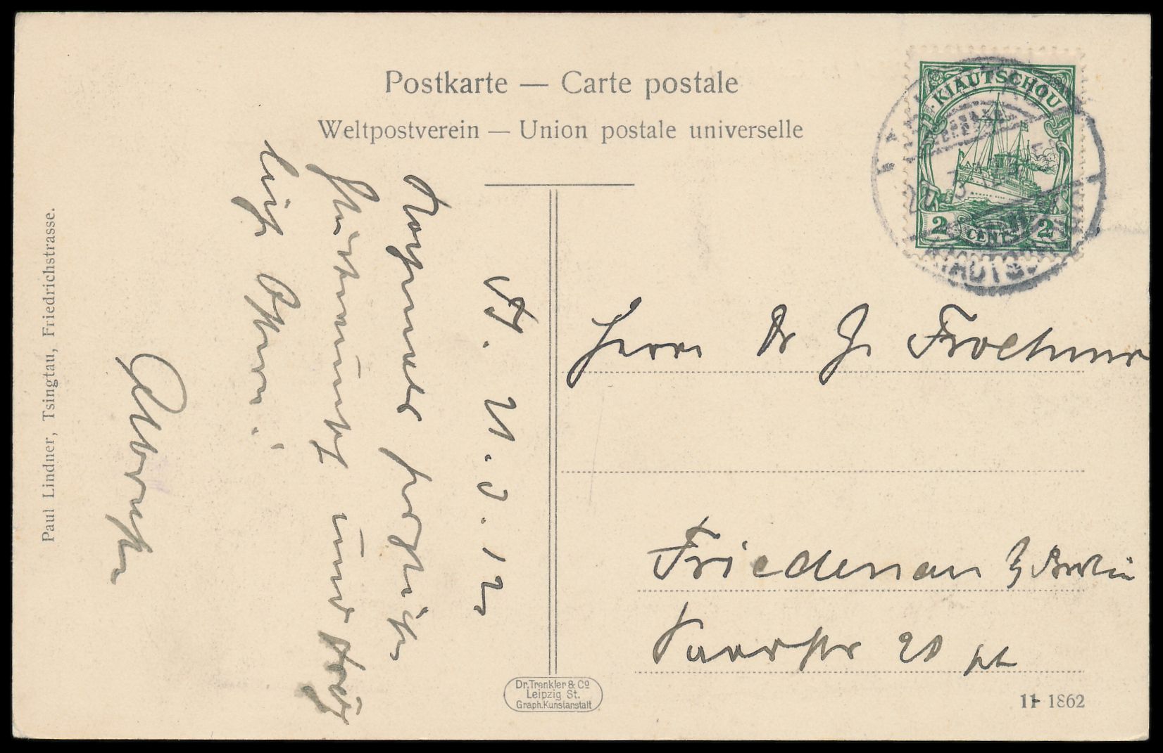 Ansichtskarte Mecklenburghaus im Lauschan, Verlag Adolf Haupt, Tsingtau, Frankatur 2 C., Gitterstempel Tsingtau 23.8.12, nach Auerbach, Bedarf