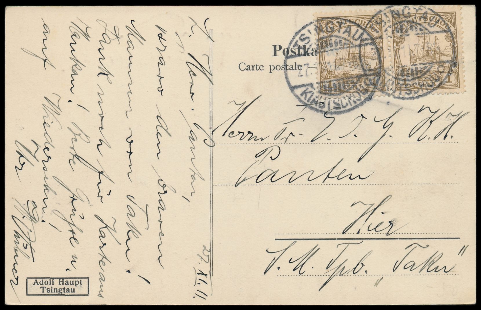 2 x 1 C. auf Ansichtskarte Tsingtau - Seemannshaus, Verlag Adolf Haupt, Tsingtau, Gitterstempel Tsingtau c 27.11.11, Ortskarte an S.M.S. Taku, Bedarf