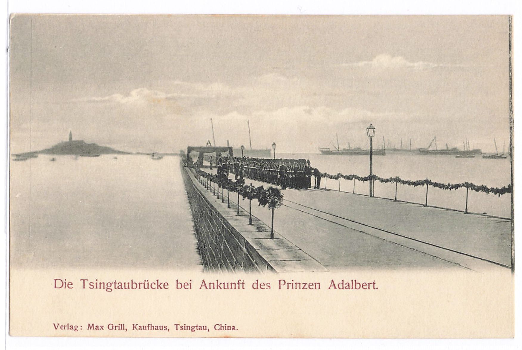 Ansichtskarte Die Tsingtaubrücke bei Ankunft des Prinzen Adalbert, Verlag Max Grill, ungebraucht