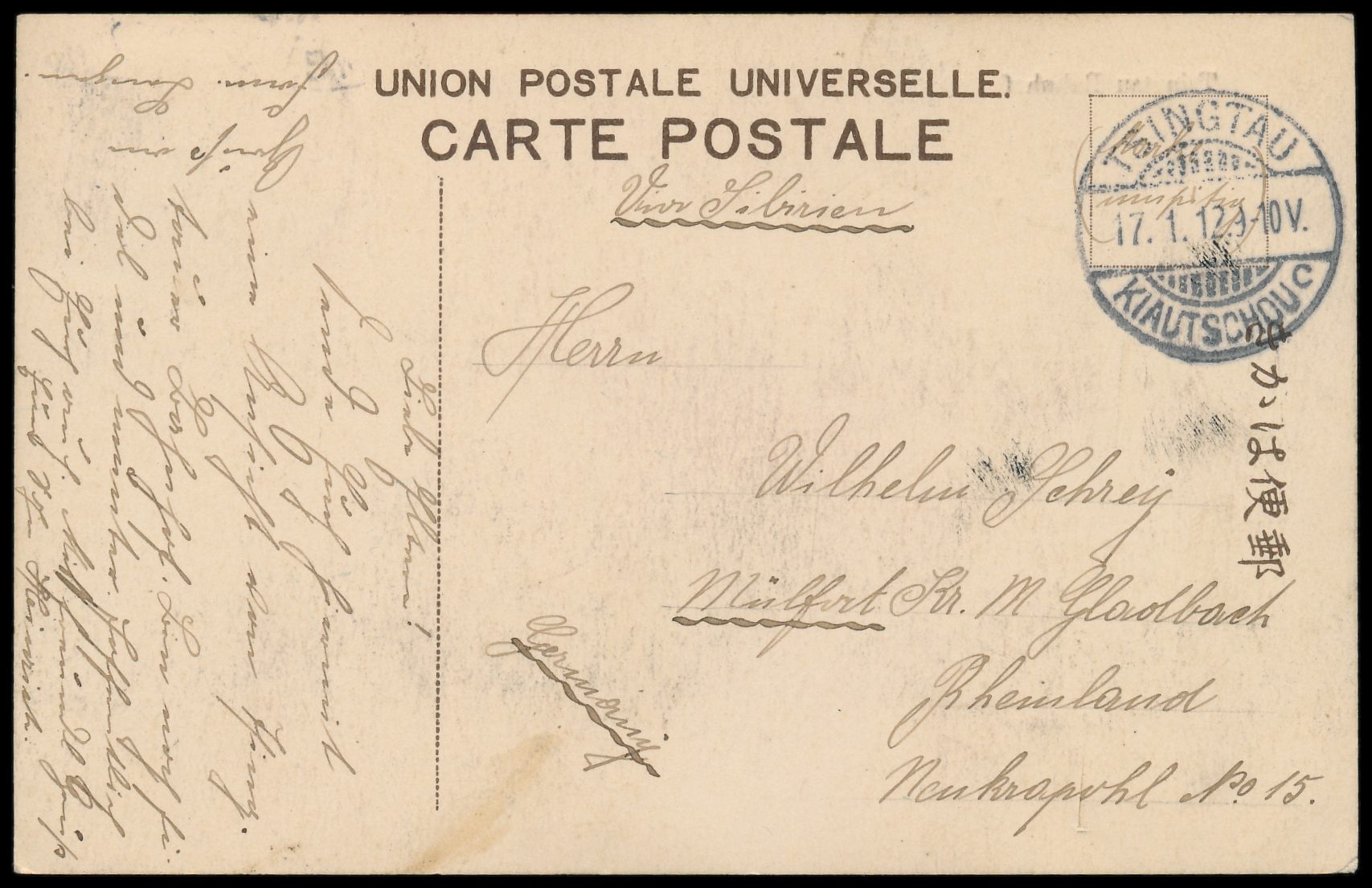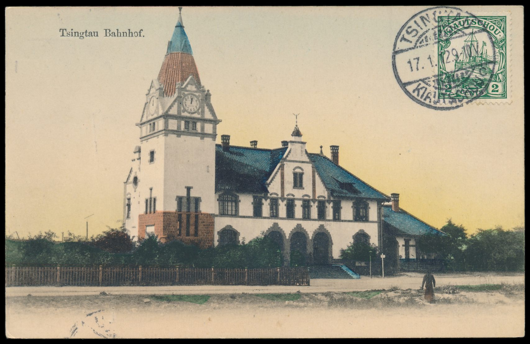 2 C. bildseitig auf kolorierter Ansichtskarte Tsingtau Bahnhof, Gitterstempel Tsingtau c 17.1.12, nach Mülfert bei M.Gladbach, Bedarf