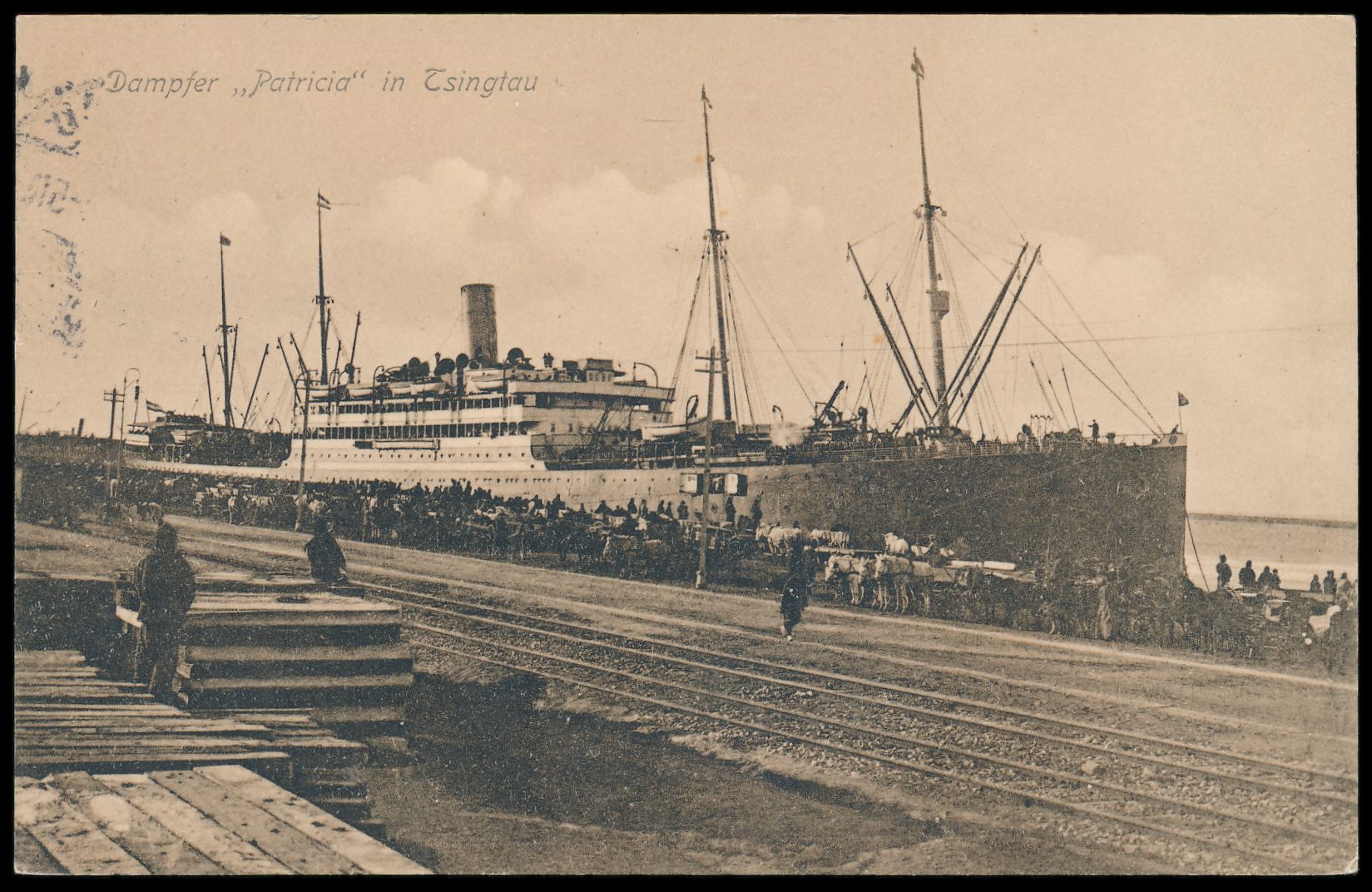 Ansichtskarte Dampfer "Patricia" in Tsingtau, Verlag Paul Lindner, Tsingtau, Friedrichstrasse, Frankatur 2 C., Gitterstempel Tsingtau c 22.3.12, nach Friedenau b. Berlin, Bedarf
