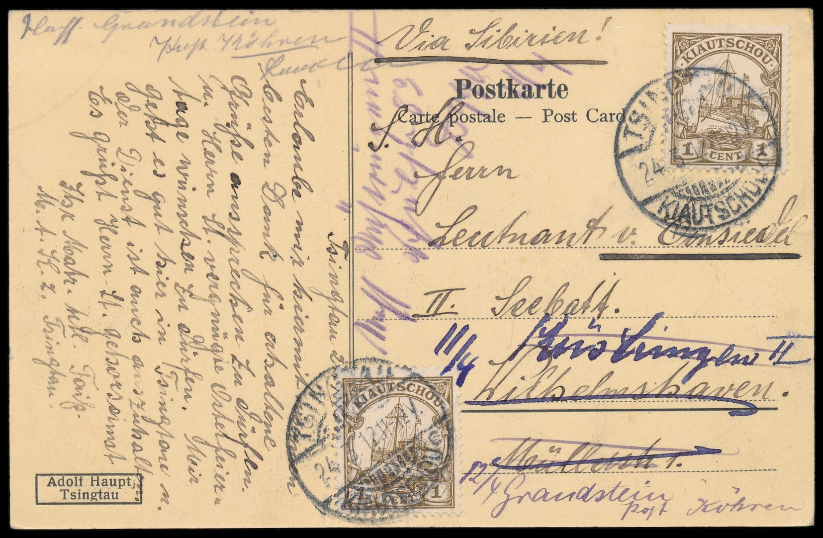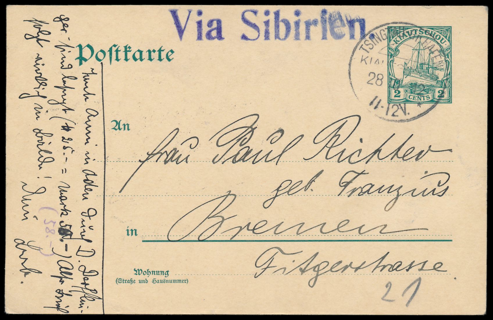 Stempel Tsingtau-Gr.Hafen 28.10.12 auf Ganzsache 2 C. nach Bremen, großer Leitstempel "Via Sibirien", Bedarf