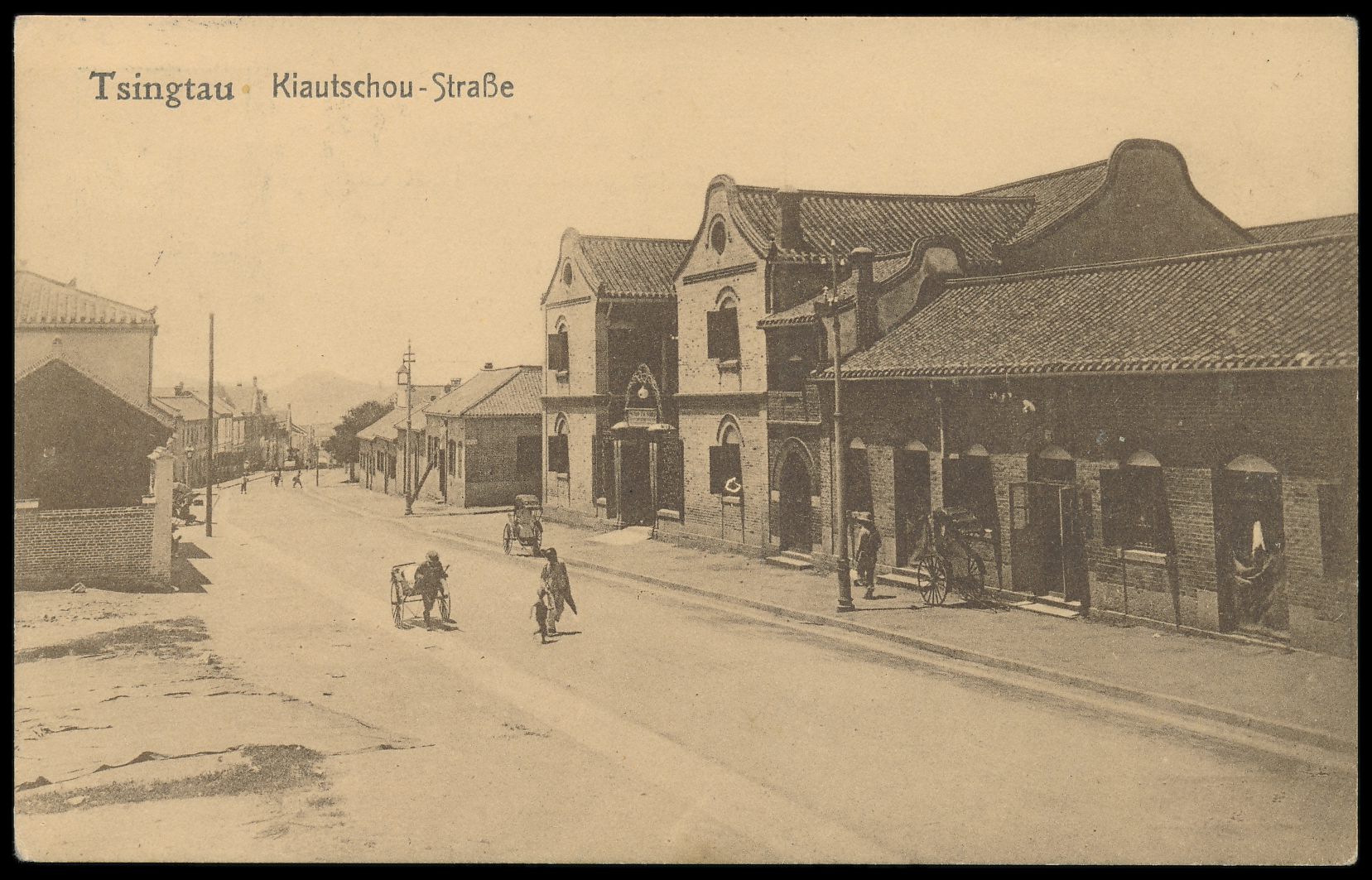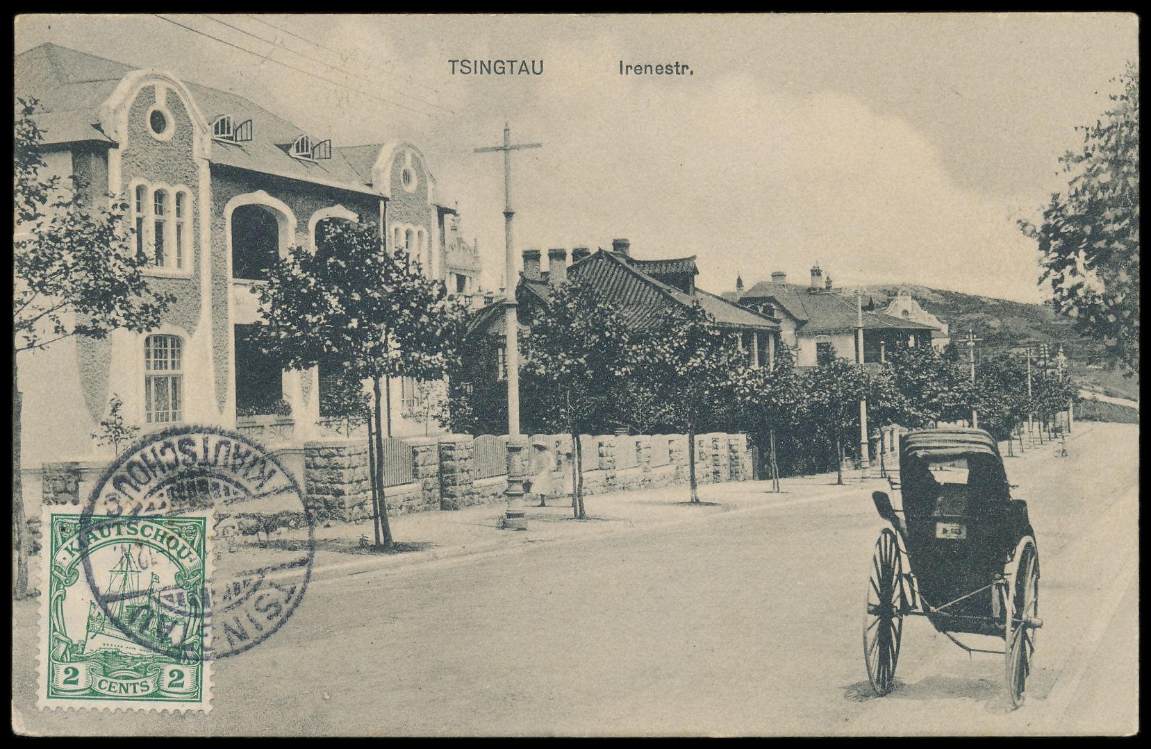 2 C. bildseitig auf Ansichtskarte Tsingtau - Irenestr., Verlag Max Grill, Gitterstempel Tsingtau c 30.3.12, nach Mühlfort bei M.Gladbach, Bedarf